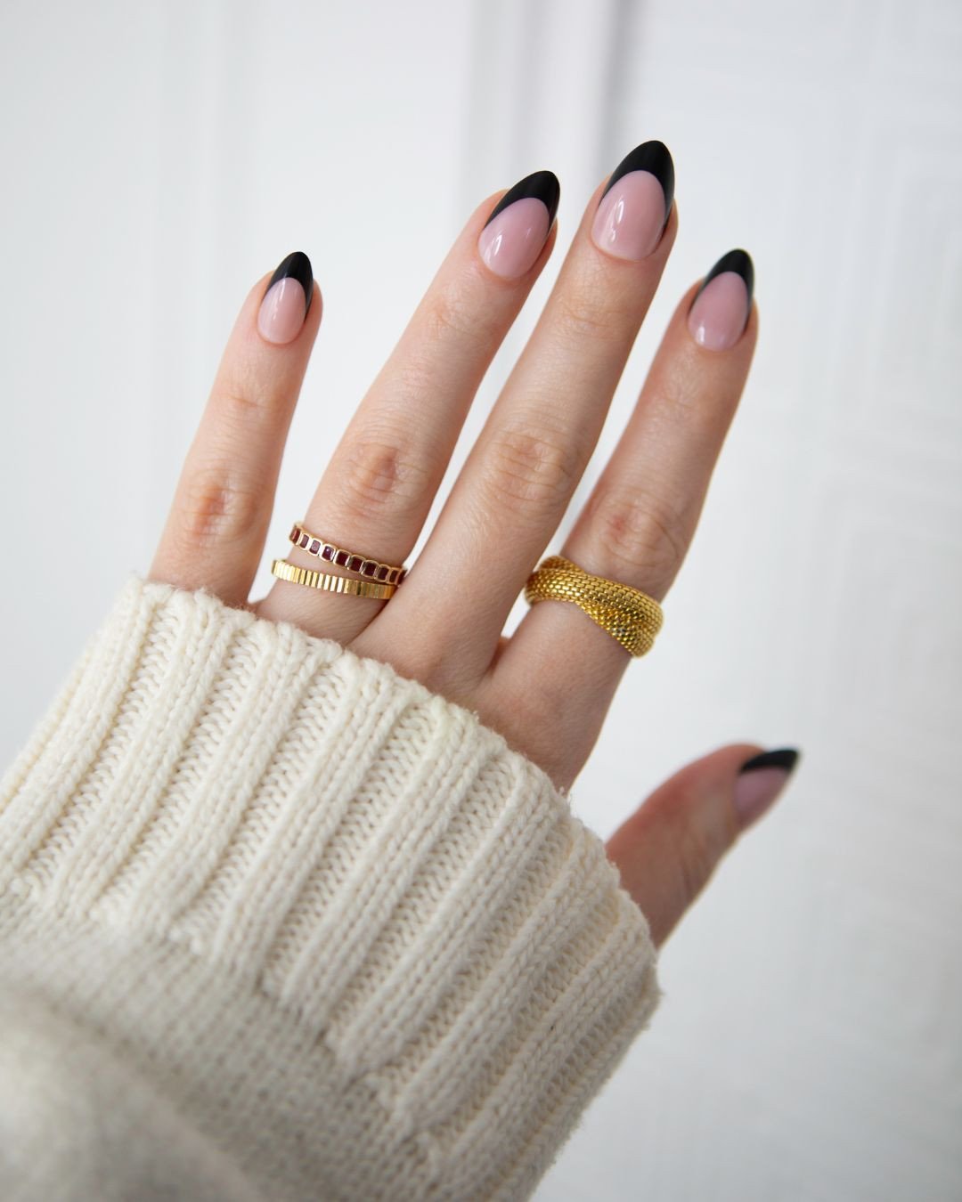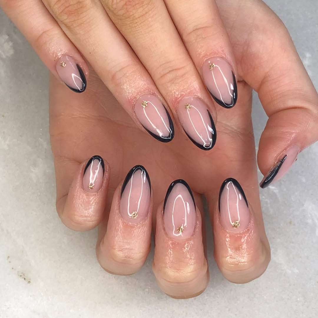 Switch the shape to almond and suddenly the whole mood softens. The black tips curve gently along the edge, creating that effortless French illusion with a modern twist.
