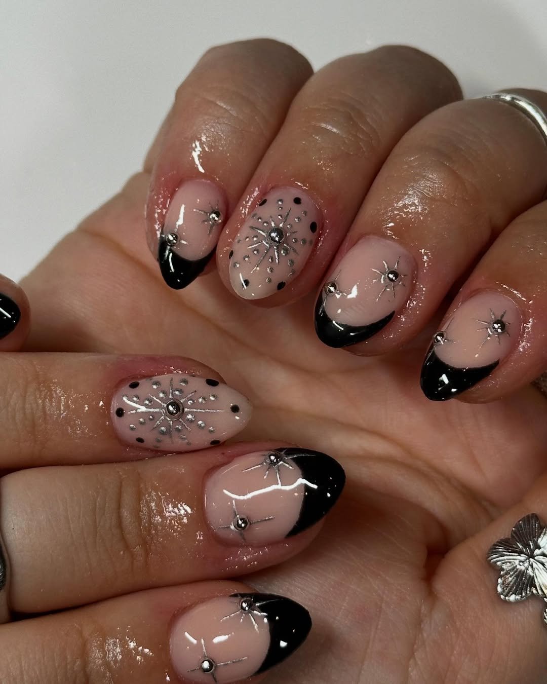 These black tips get a playful twist with tiny starburst gems and dotted accents. The design feels a little retro, a little glam, and completely eye-catching.
