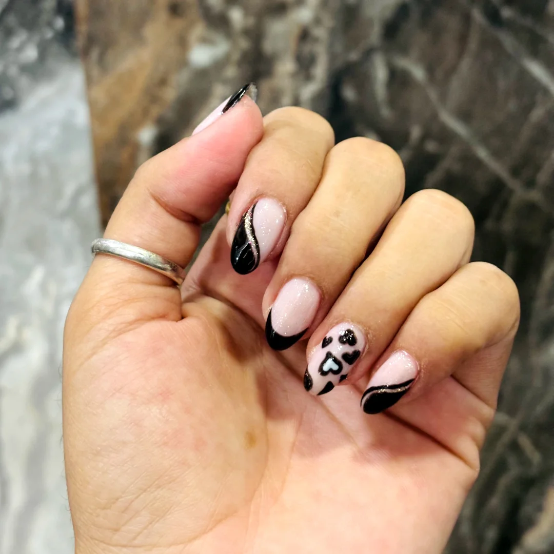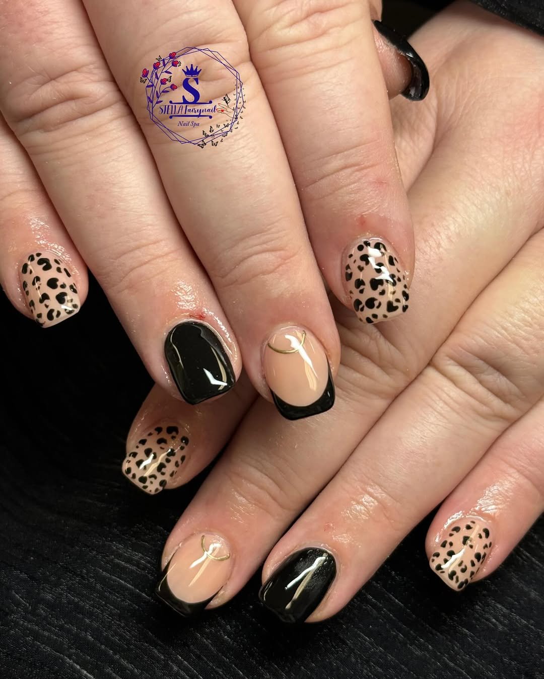 Mixing black tips with leopard accents gives this set a playful edge. The warm nude base keeps everything cohesive, while the animal print adds personality.