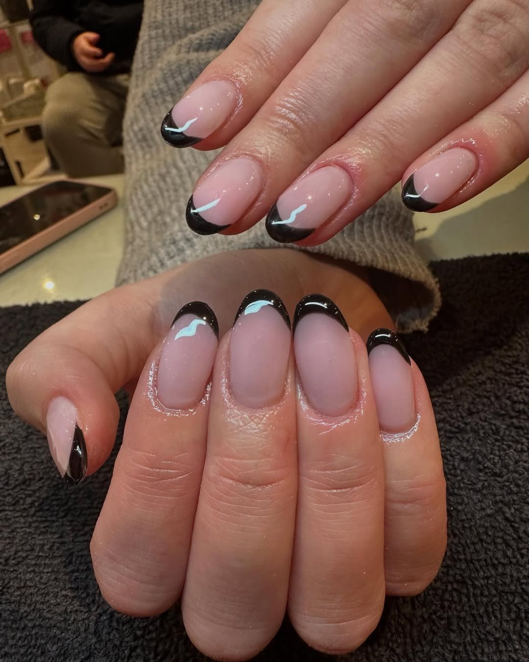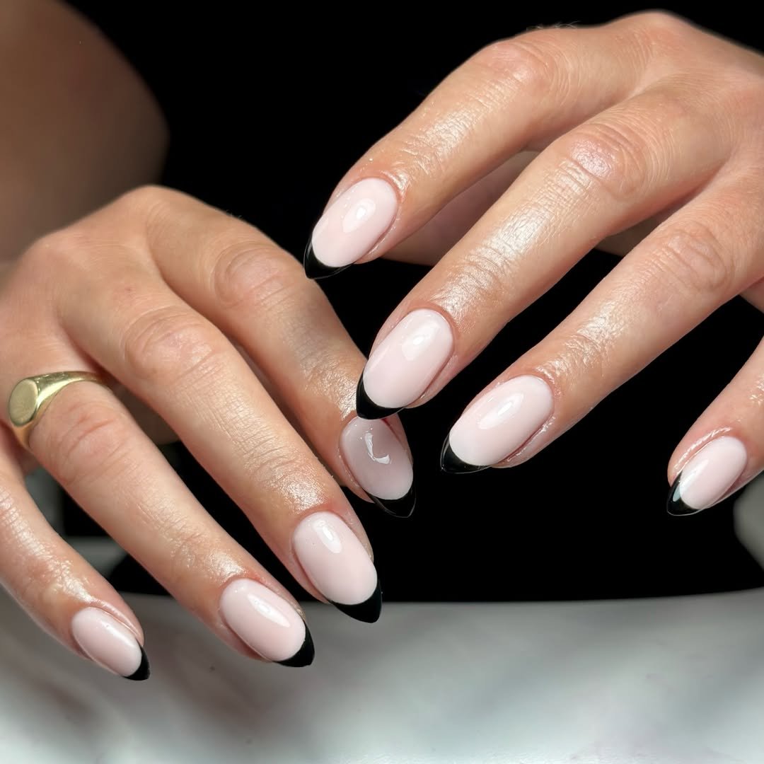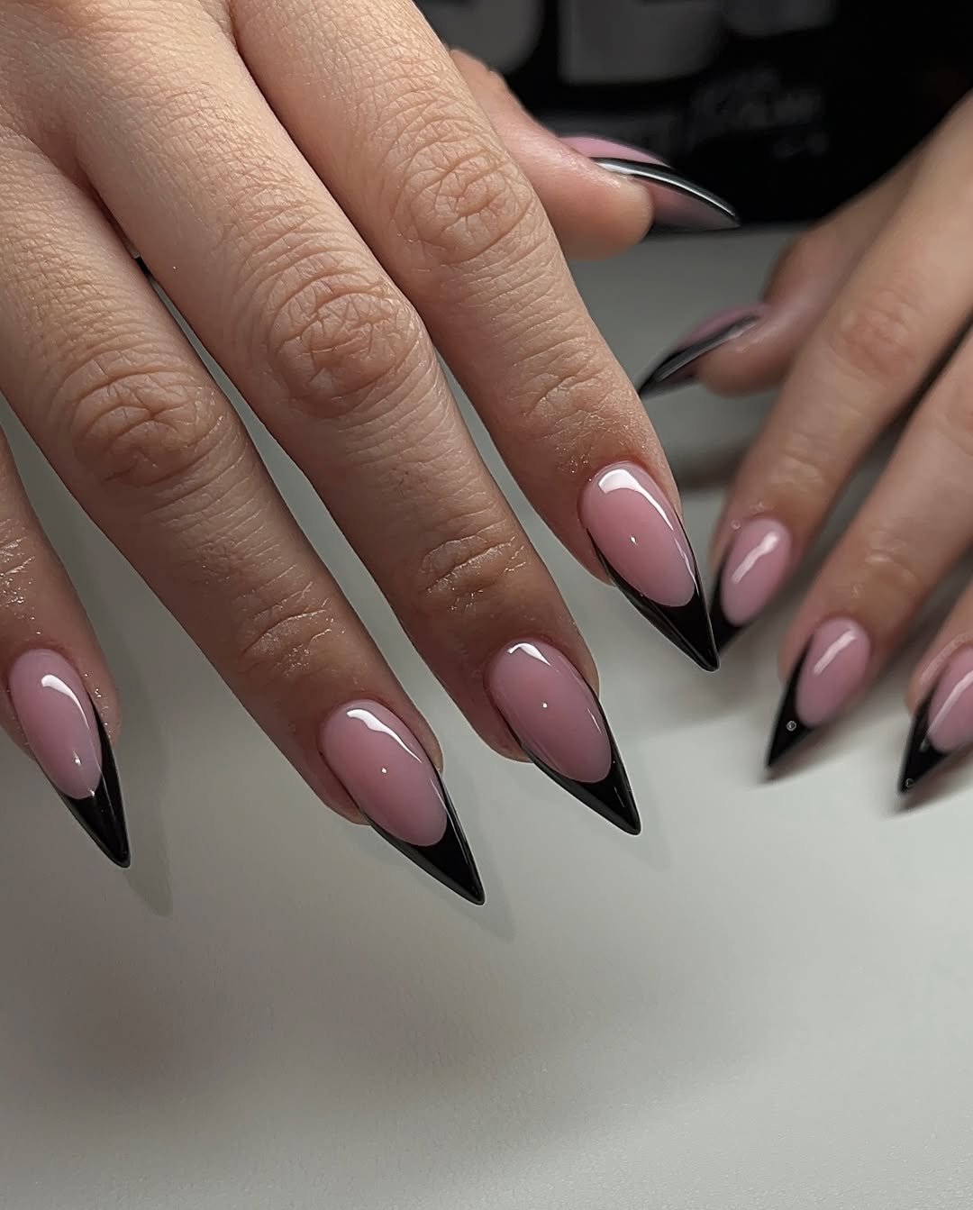 Sleek almond nails with glossy black tips and a muted pink base always hit. The contrast is clean, simple, and undeniably chic.
