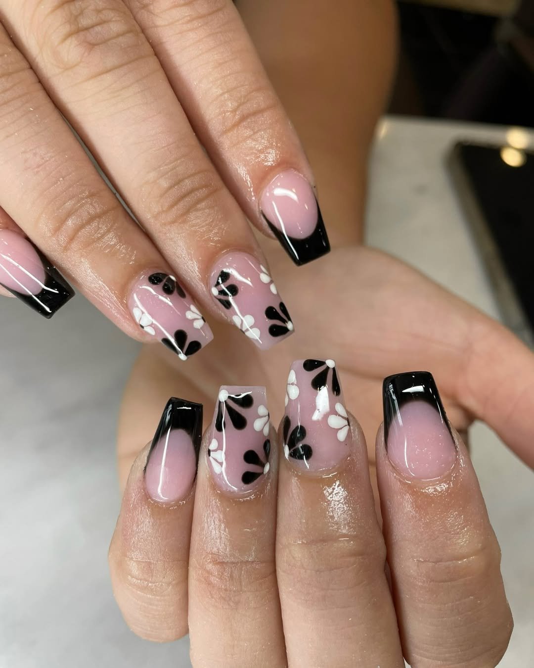 This one feels like spring flirting with edge. Classic black tips meet soft pink and playful black and white floral art, creating that sweet-meets-structured balance.