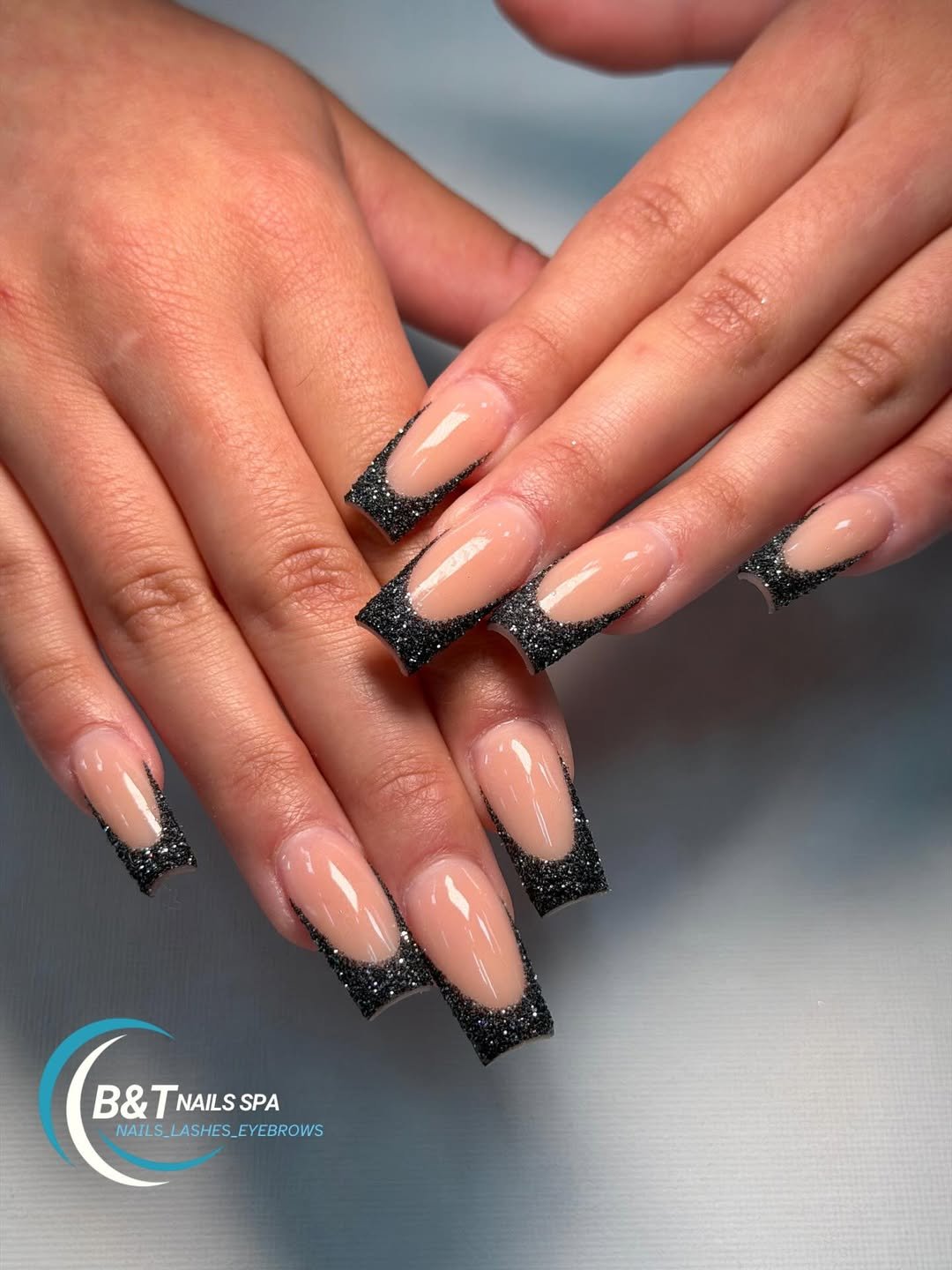 These elongated square nails feel dramatic in the best way. The black glitter tips add texture and depth, almost like crushed velvet at the edge of a silk gown.