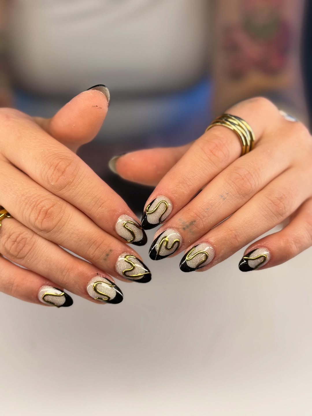 Here, black tips meet shimmering champagne tones and raised gold swirls that catch the light with every movement. The almond shape softens the bold contrast, creating a balance between glam and grace.