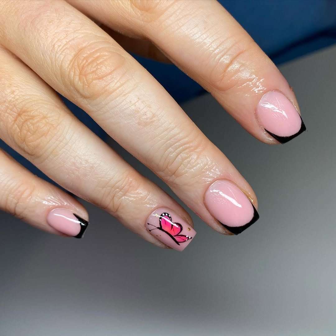 Short, rounded nails with black tips already feel fresh, but that tiny pink heart detail steals the show. It adds personality without overpowering the clean design.