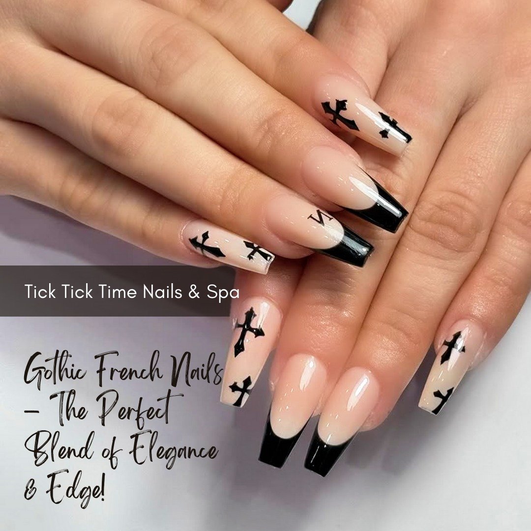 This set leans into drama, and it does it beautifully. Long square tips in glossy black paired with bold cross accents give that gothic-inspired twist, while the nude base keeps it grounded.