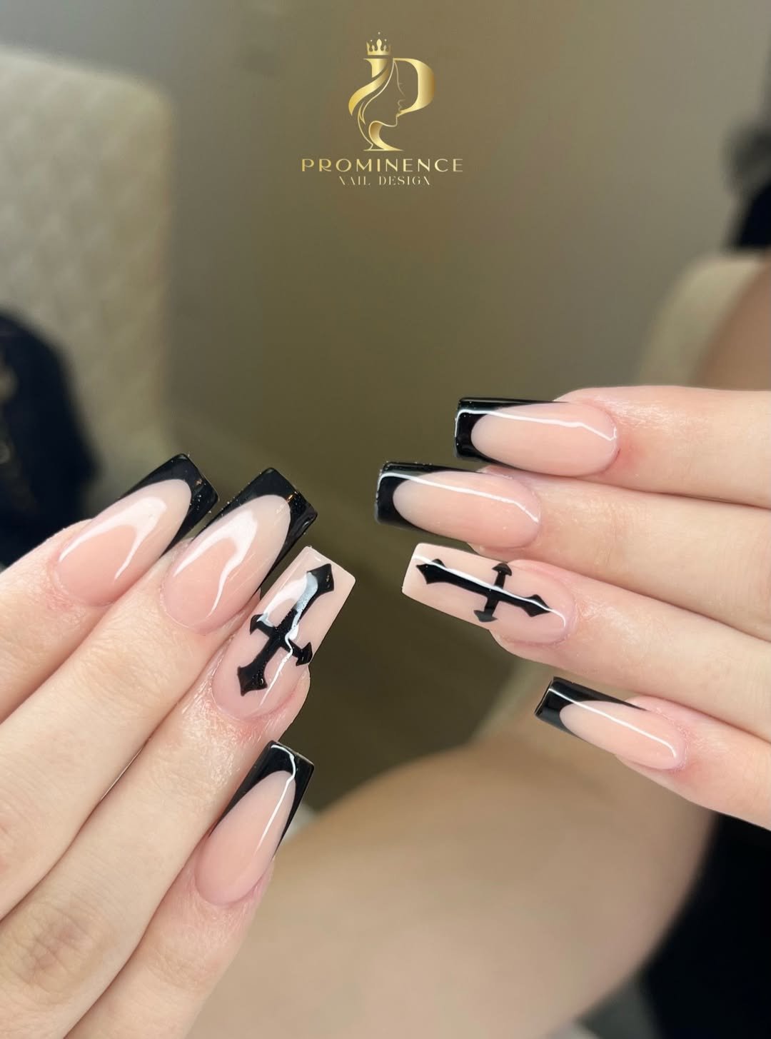 These square black tips paired with bold cross accents lean into a dramatic vibe without losing polish. The nude base keeps it wearable, while the graphic black details bring attitude.