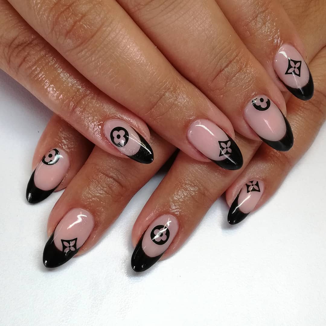 A classic pink base with glossy black tips already feels timeless, but those designer-inspired accents take it somewhere bolder. The tiny black motifs sit like little stamps of confidence across each nail.
