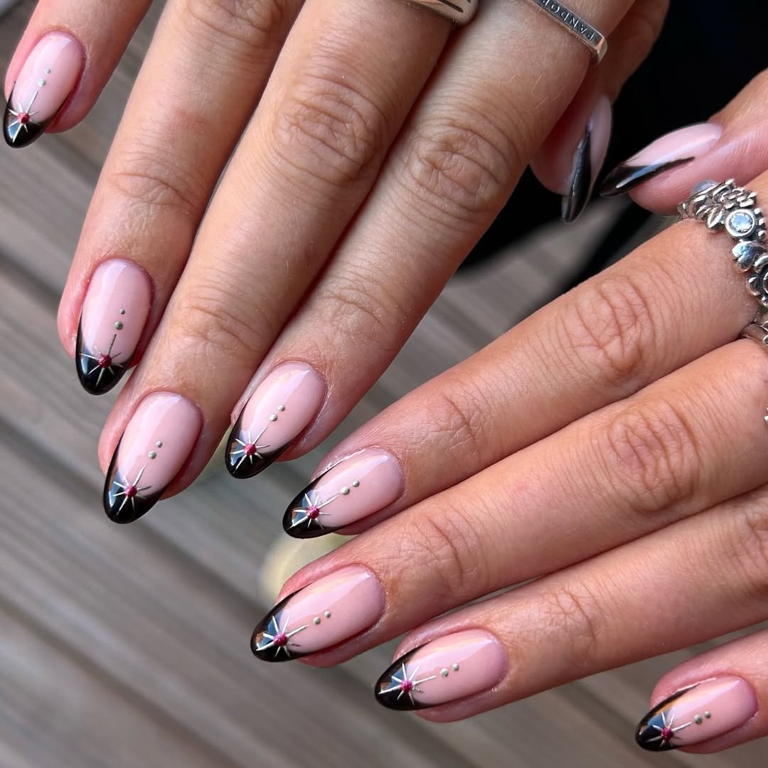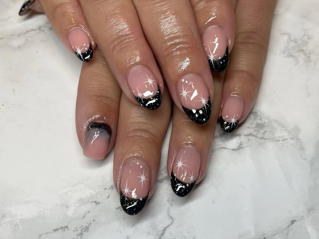 Black French tips meet tiny constellations and suddenly your nails feel like a midnight sky. The delicate starbursts and dot details bring in a hint of sparkle without overwhelming the clean almond shape.