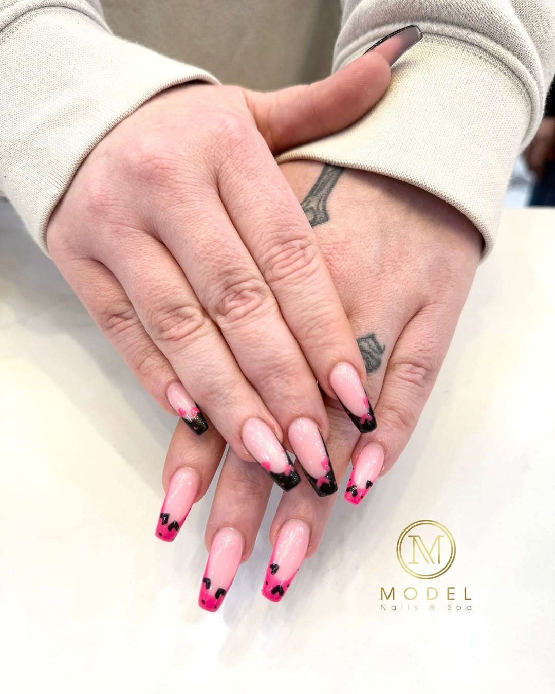 Here’s where black tips get a little fun. The hot pink fade blending into glossy black edges feels vibrant and full of personality, especially with those tiny heart details scattered throughout.