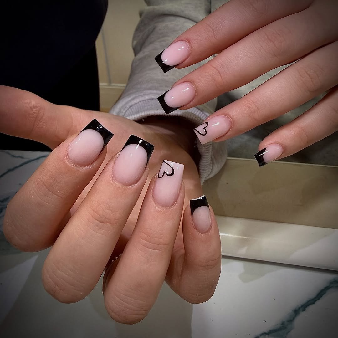 Classic black tips get a soft twist here with tiny heart accents placed just right. The short square shape keeps it practical, but the detail adds charm.