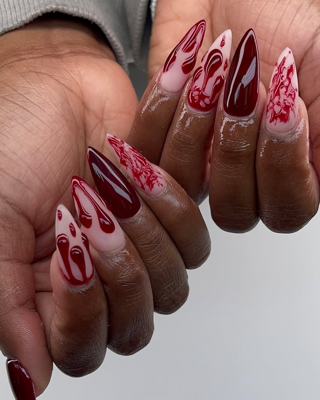 Sharp, almond claws with dripping blood and marbled red texture? Yes please. This is the kind of artistry that’s both graphic and wearable—the depth in those swirls gives it a mesmerizing edge. Some drips are clean and others chaotic, like a spooky dream unraveling.