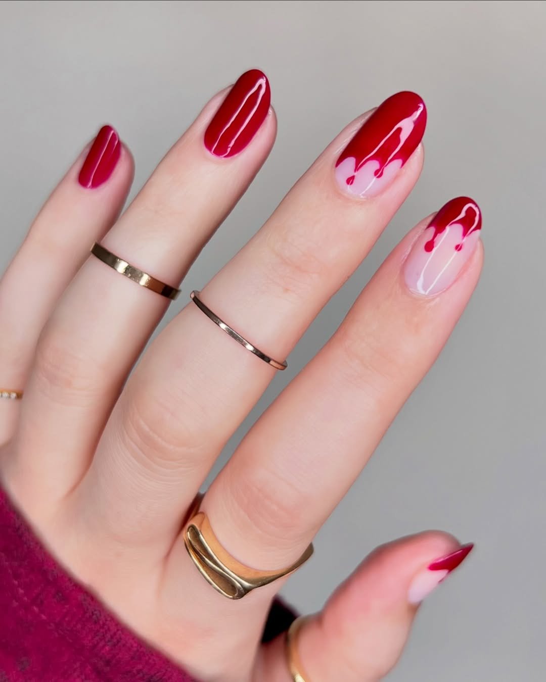 If “blood but make it party” is a thing, @naturalnailss__ nailed it (literally). This set dances between scary and sparkly, with glittery red gel giving each drip a glistening, high-shine finish. The almond shape keeps things wearable, while the variety in design placement makes it feel custom.