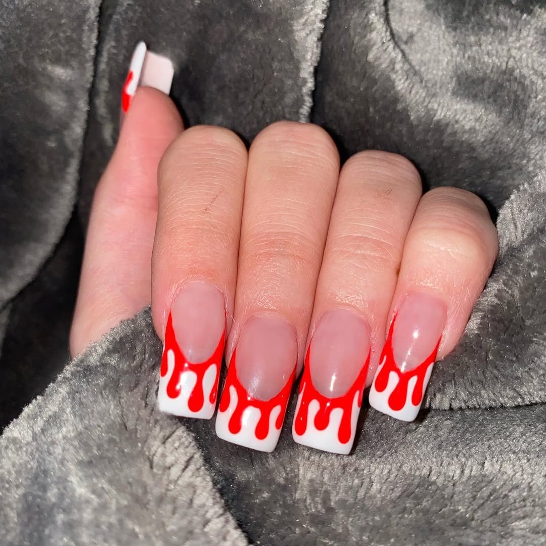 This look almost feels like a Halloween treat—clean white tips dripping with bold red polish like glossy icing. The square shape keeps things sweet and structured, while the red and white contrast screams festive.