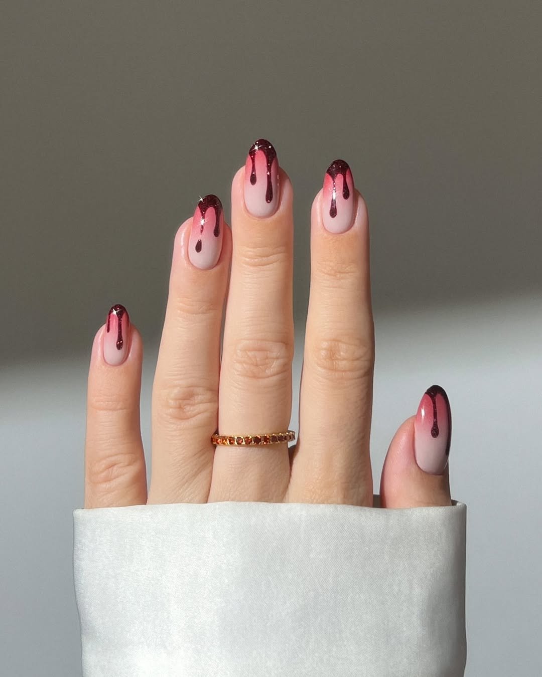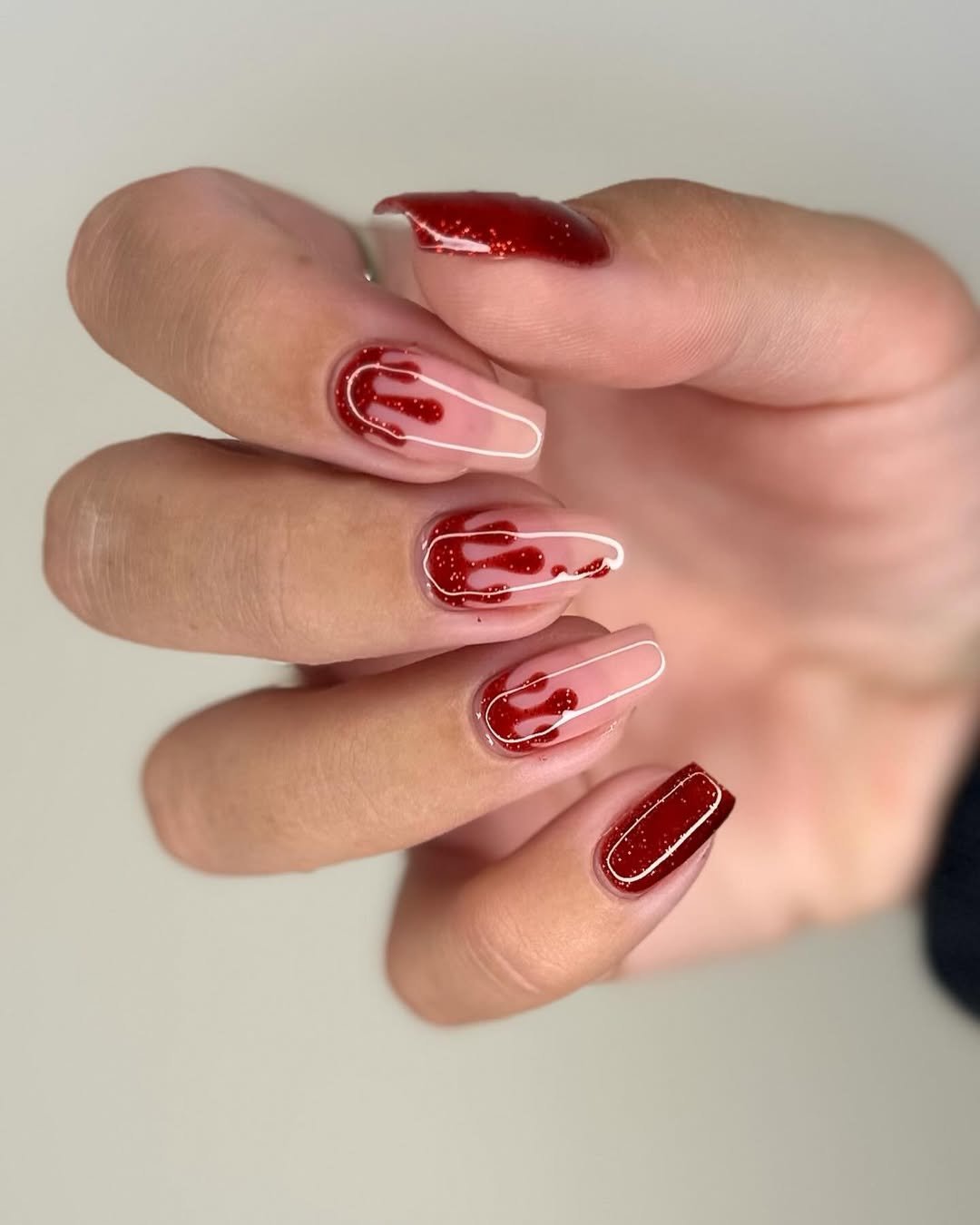 There’s something unexpectedly elegant about this take. The wine-colored glitter drips feel a little less “horror movie” and a little more “Gothic glamour.” Paired with a soft blush base, it’s spooky meets sweet—and the balance is chef’s kiss.
