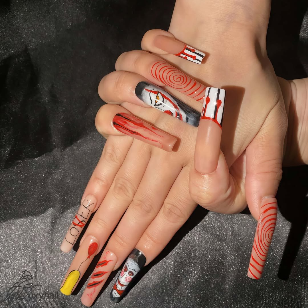 Okay, if there were an Oscar for nail artistry, this would be nominated. Pennywise, the red balloon, dripping “loser” letters… this entire set is a cinematic horror masterpiece in micro. The hand-painted details are insanely crisp, and the red swirl? Total visual hypnosis.