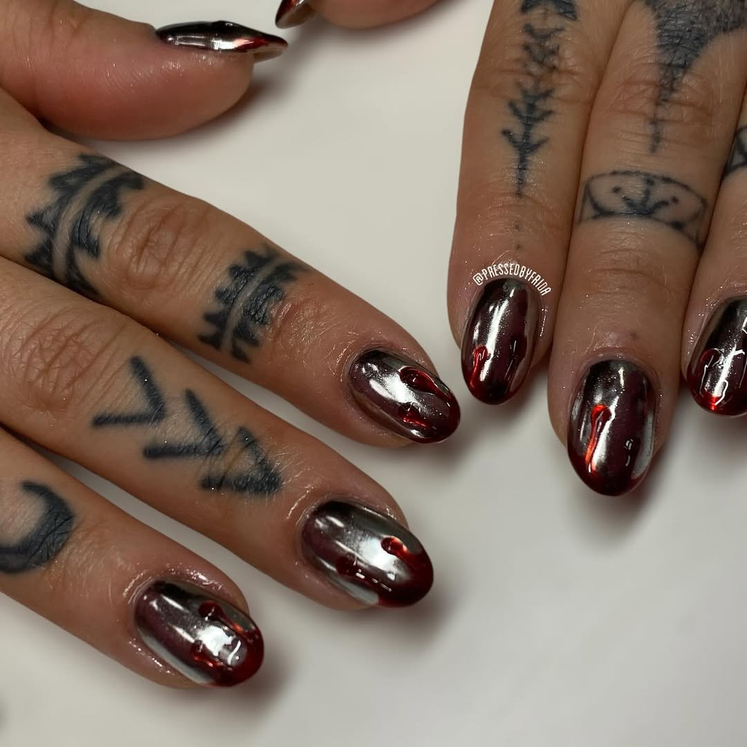 @pressedbyfrida’s set is all sharp edges and molten metal. Chrome tips with deep crimson drips create a futuristic, villainous energy—like vampire armor turned manicure. The mix of blackened chrome and blood-like droplets feels luxurious but sinister.