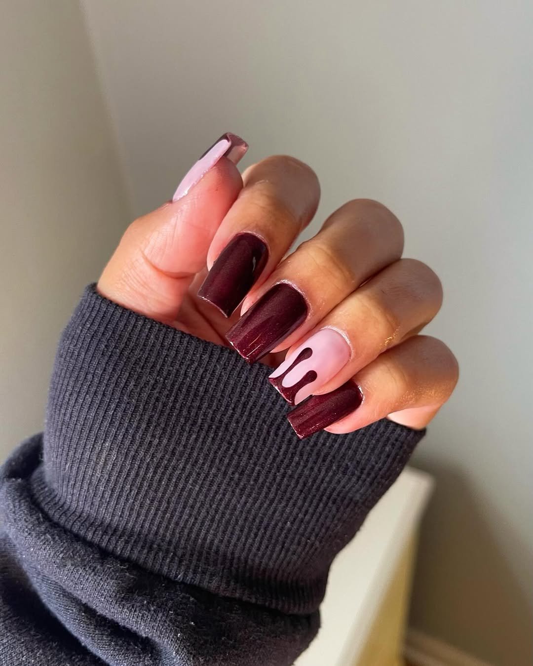 Deep burgundy tips with a single standout drip accent make this set feel surprisingly wearable for every day—if you like a little edge. That shimmer isn’t too flashy, just a soft gleam that catches the light.
