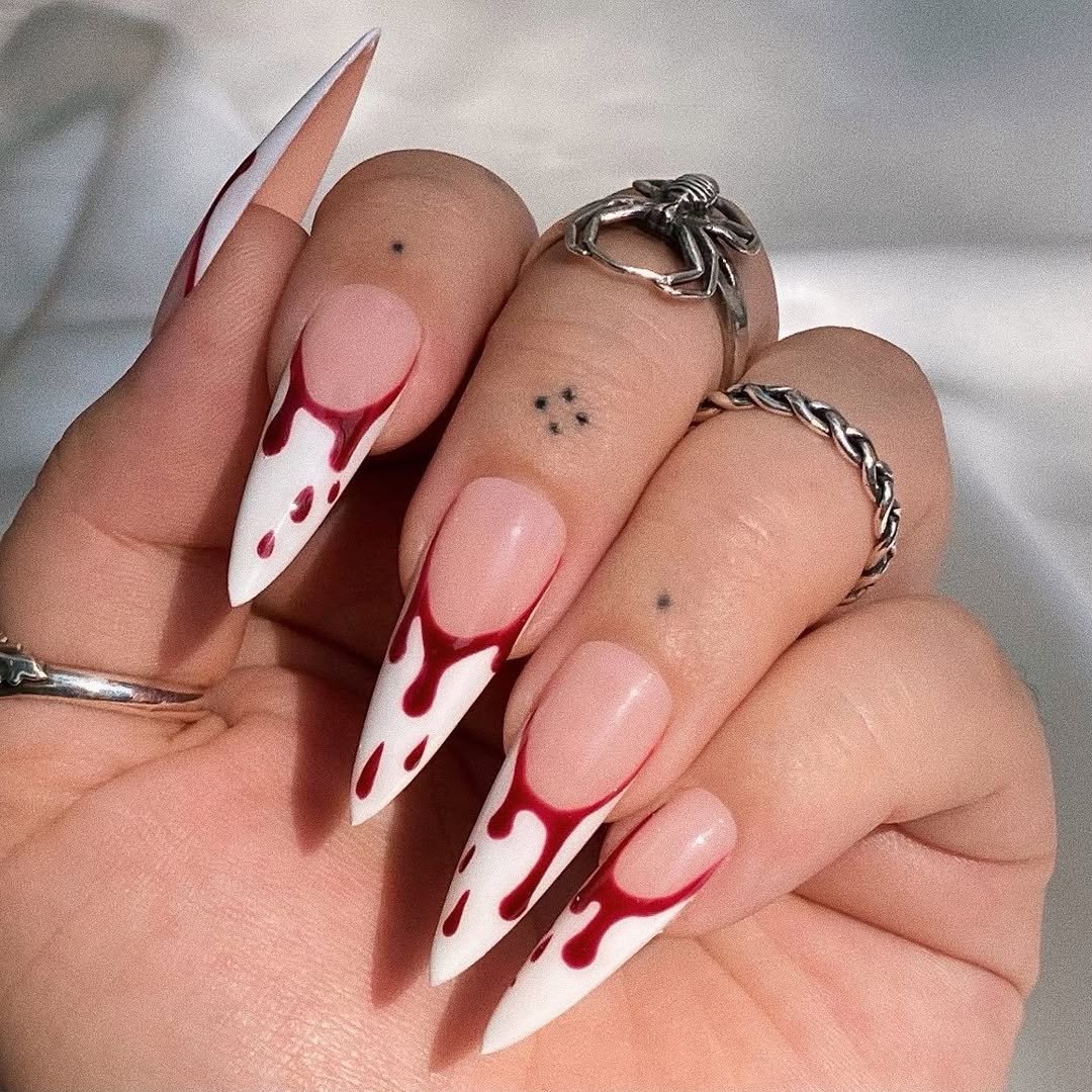 Ending strong with this stiletto moment—milky nude fading into glossy crimson drips over a stark white French tip. It’s sharp, sultry, and slightly dangerous in the best way. The shape alone makes a statement, but those painted-on blood trails? Pure drama.