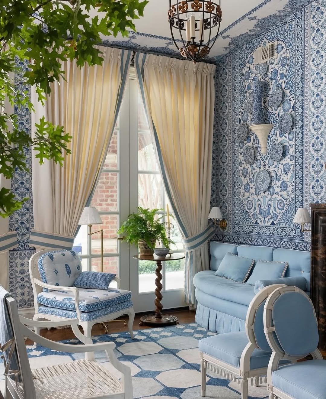 This one goes all in on pattern—and doesn’t hold back. The blue-on-blue detailing across walls and furniture creates a layered, immersive look that feels almost like stepping into a painting.