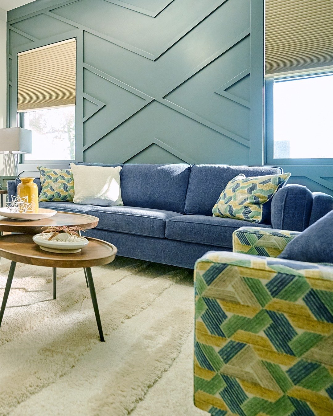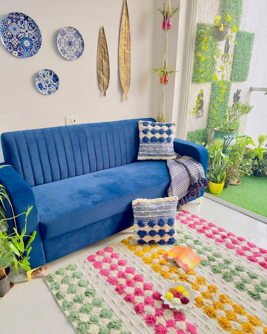 Clean, bright, and super easy to love. The blue sofa with geometric green accents keeps things modern without feeling cold. It’s simple, but not boring.