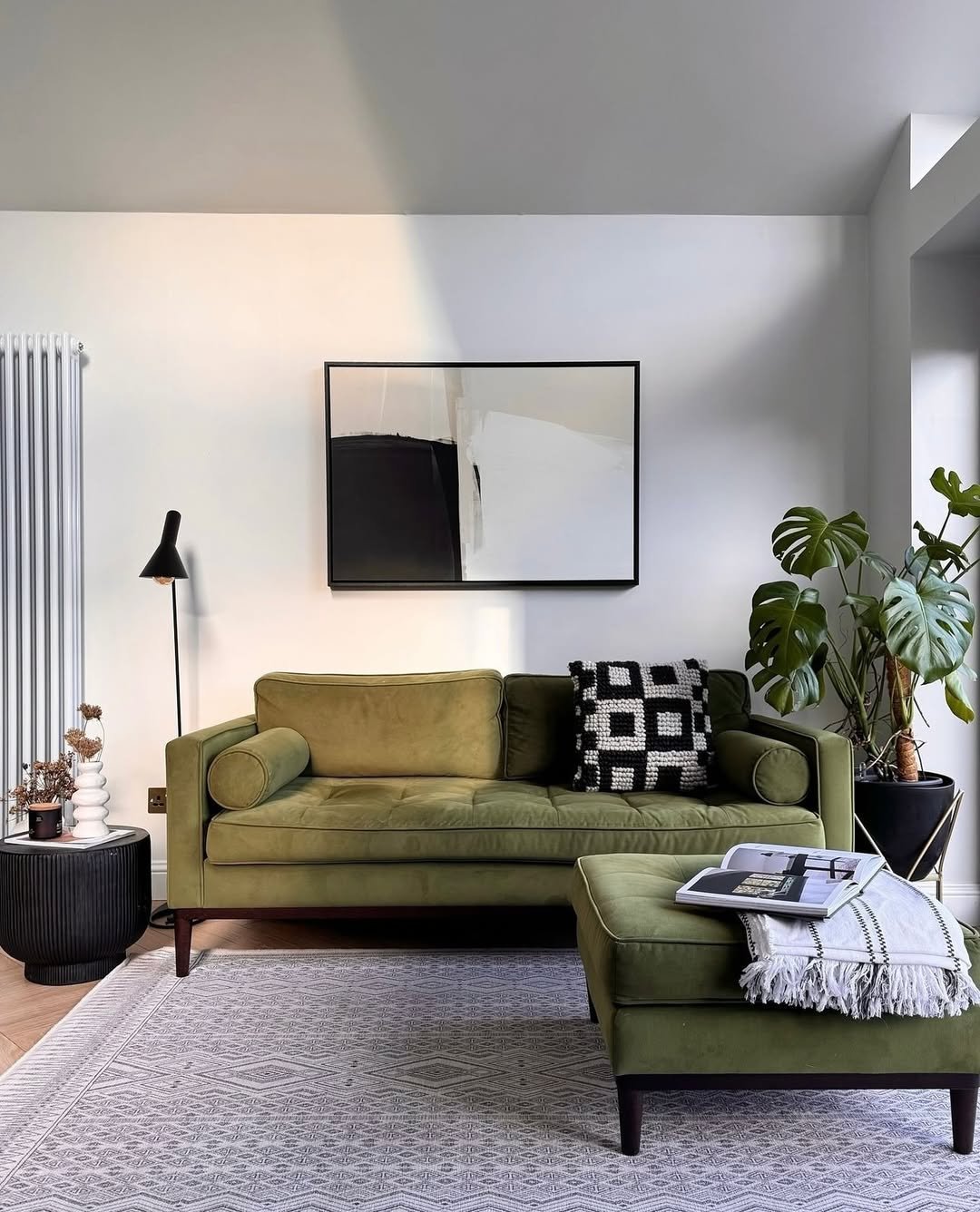 This space feels like a deep exhale. The soft olive sofa against that clean, light wall creates a perfect balance—nothing loud, nothing forced, just effortlessly styled. The black accents in the artwork and lamp keep it grounded, while the greenery subtly pulls everything together without trying too hard.