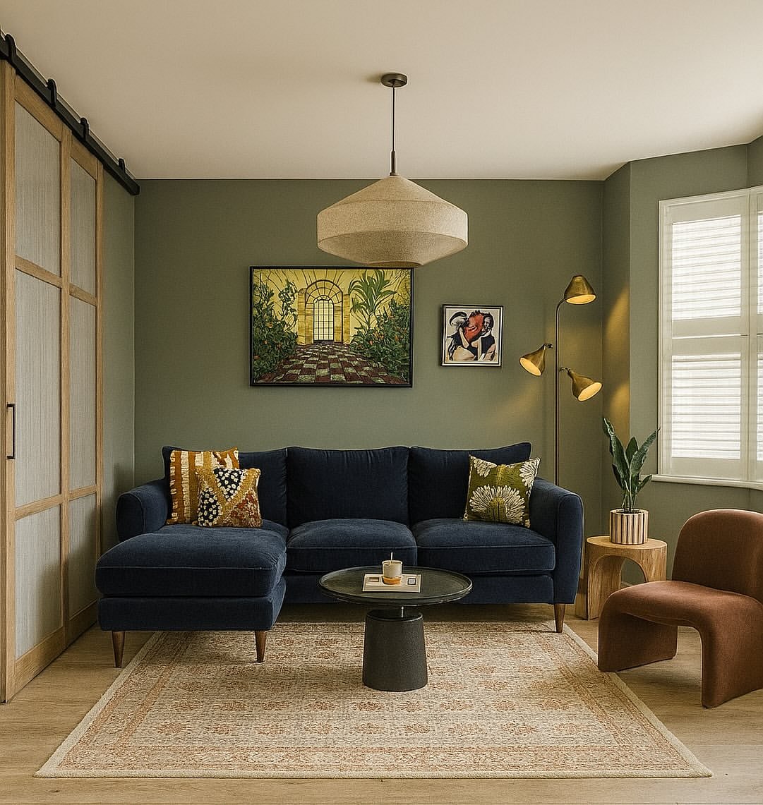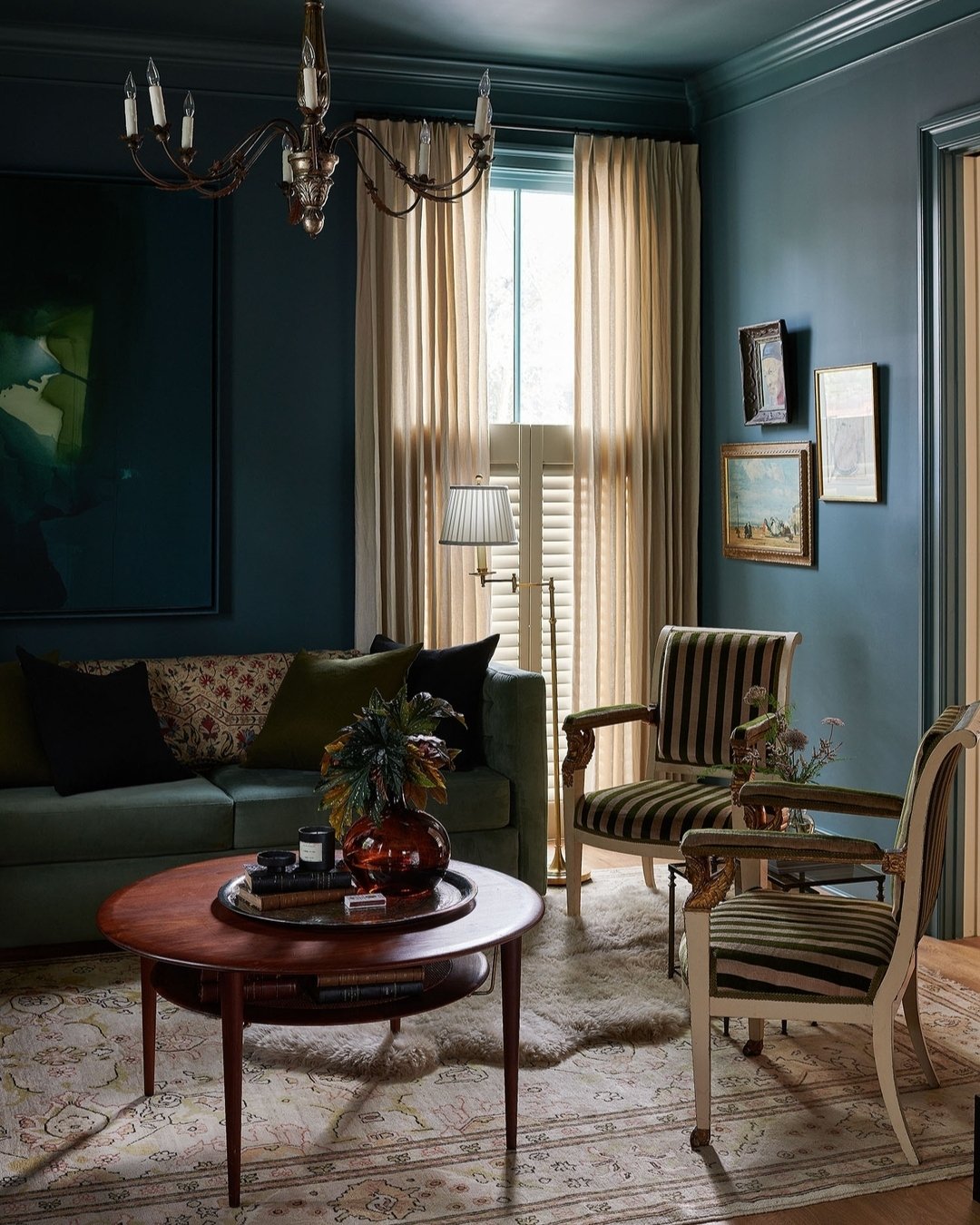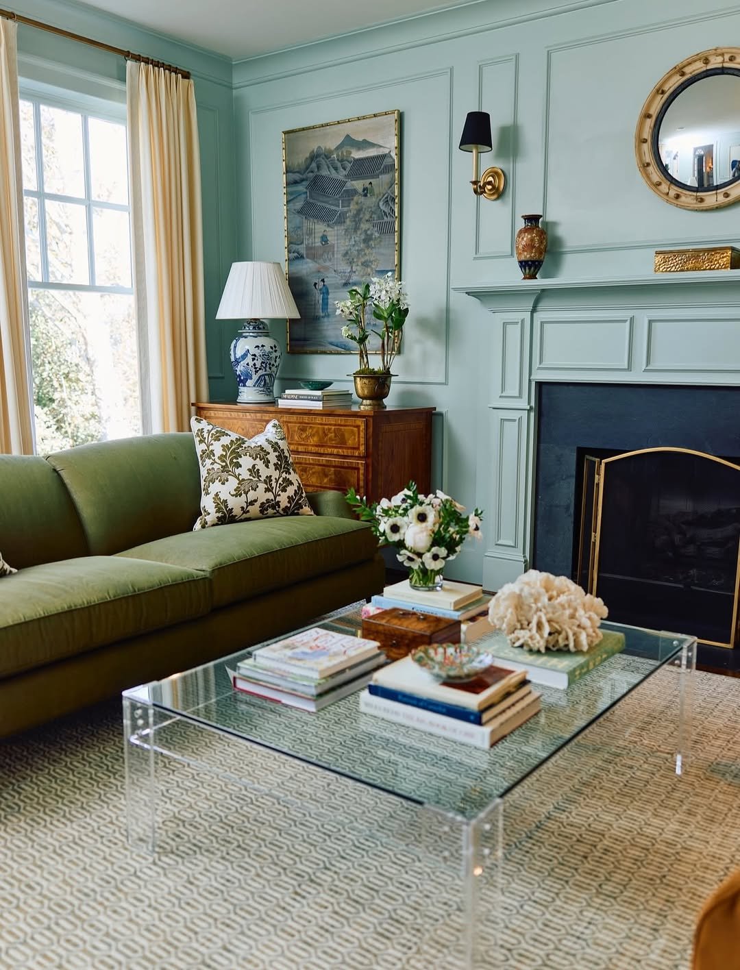 This one leans into timeless style with a fresh twist. The muted green sofa against those soft blue walls feels calm and collected, while the warm wood tones keep everything grounded.