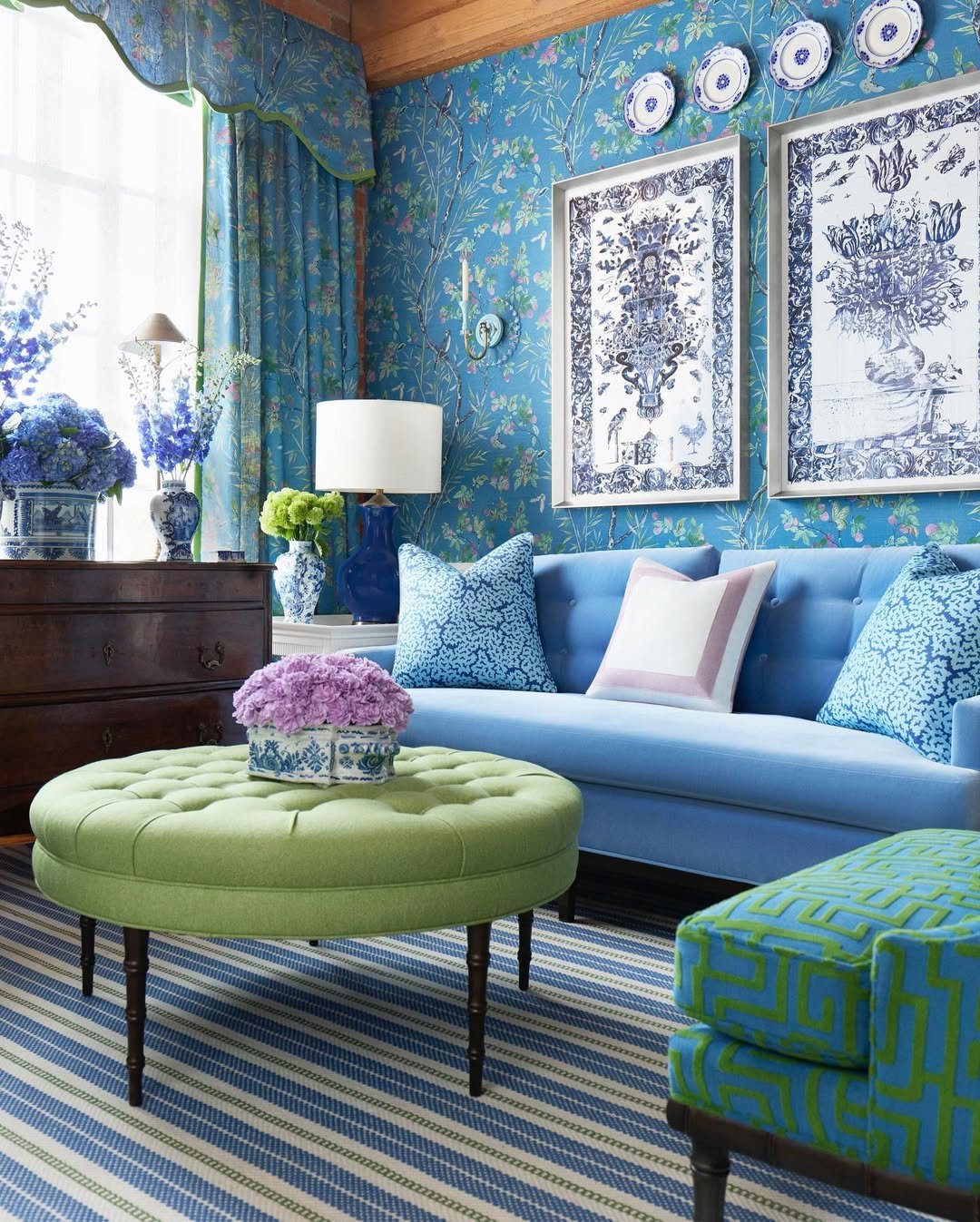 This one is all about pattern—and it fully commits. The blue and green prints layered across walls and furniture create a rich, traditional look that feels straight out of a design book.
