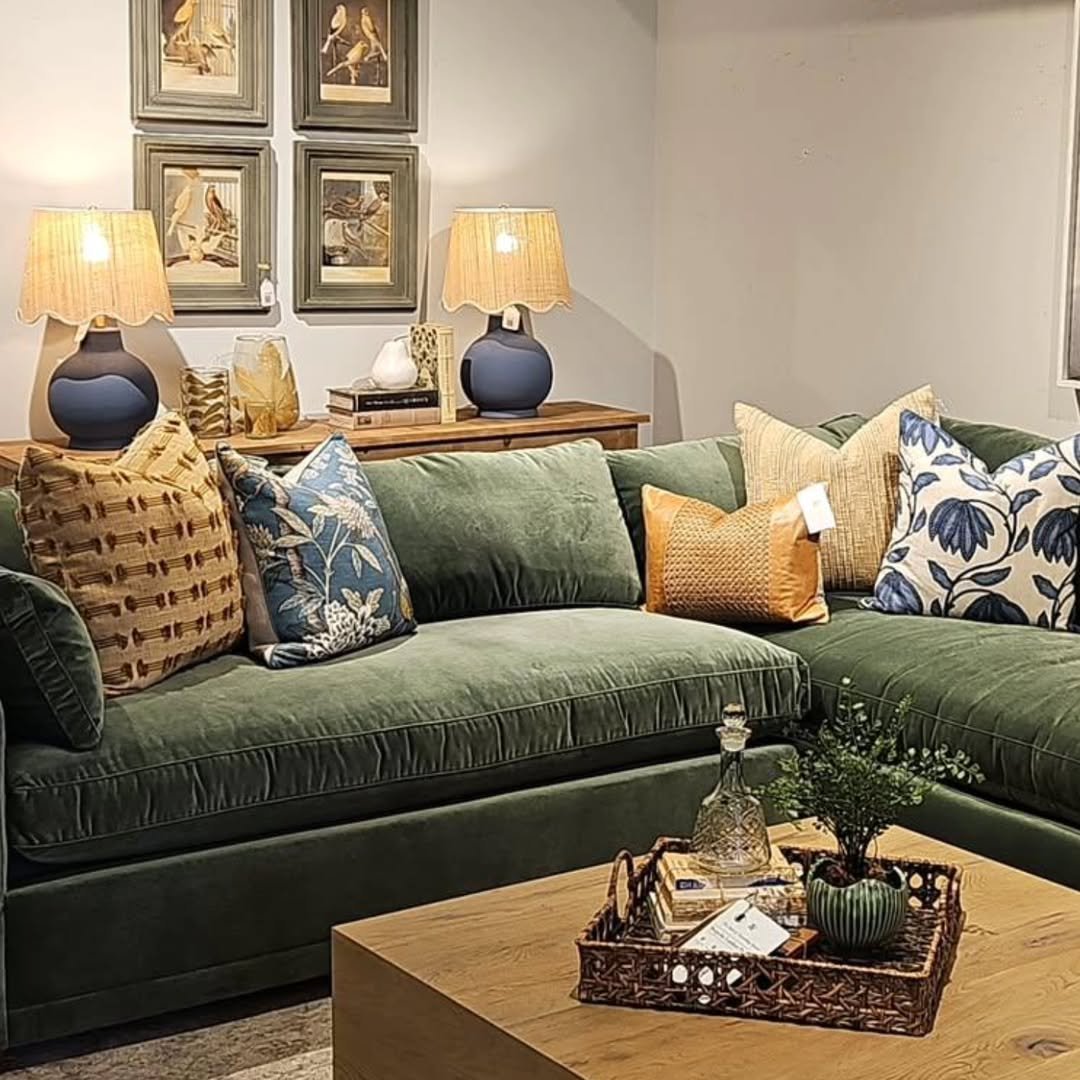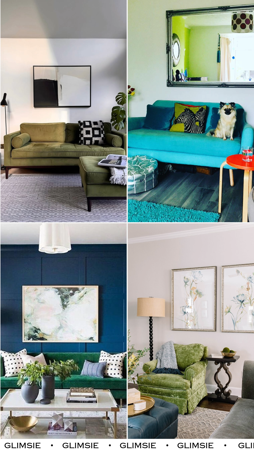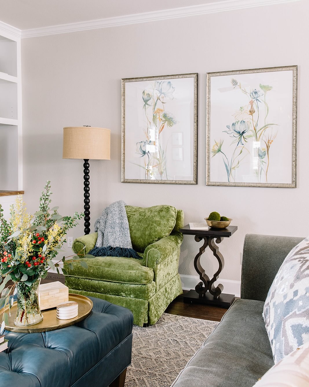 This look leans softer and more timeless. The muted green seating mixed with light walls and delicate artwork creates a calm, almost airy vibe. Nothing is overpowering, but everything feels intentional.