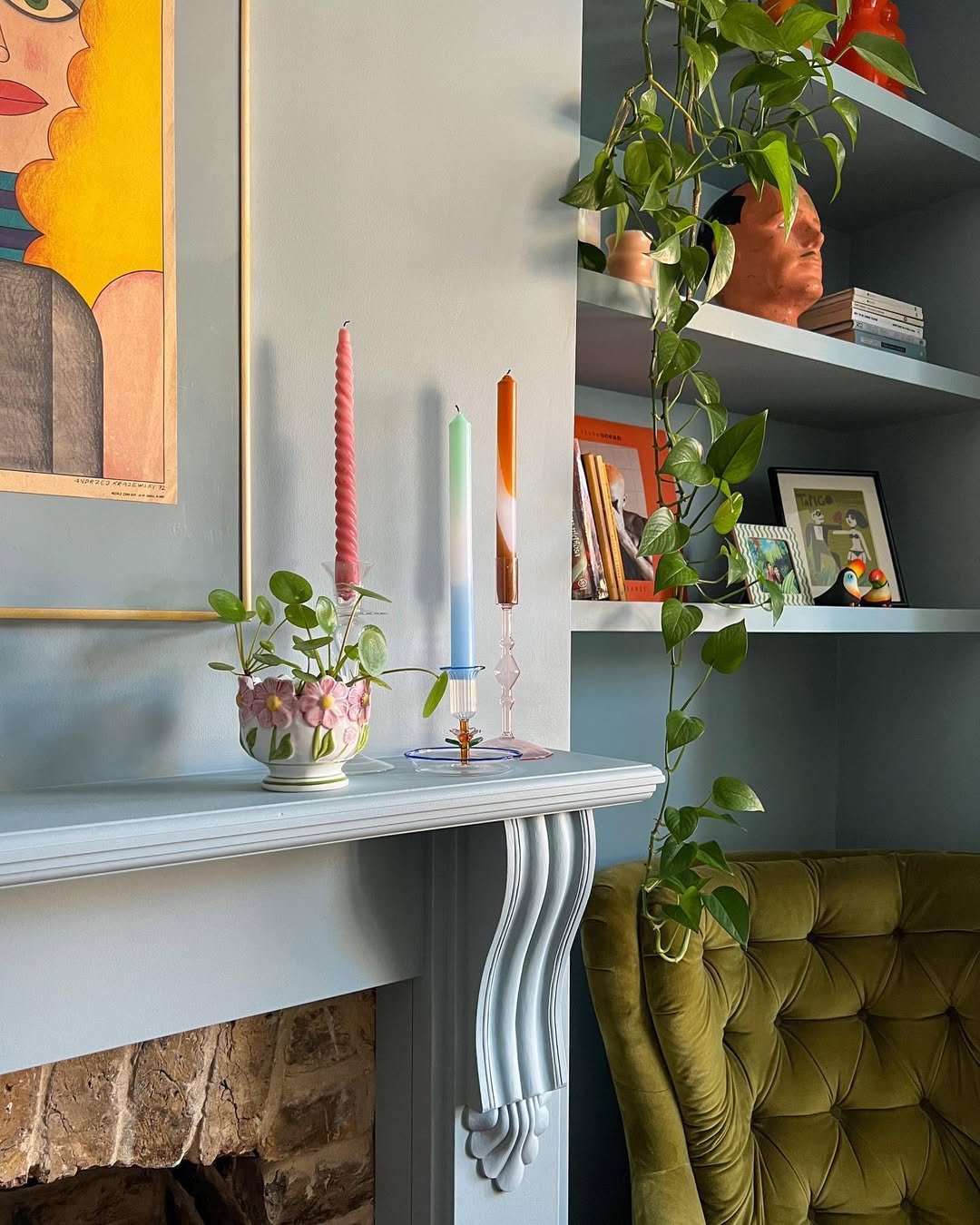 This space feels creative and full of personality. The soft blue backdrop with pops of green and playful decor pieces makes it feel curated but still fun.