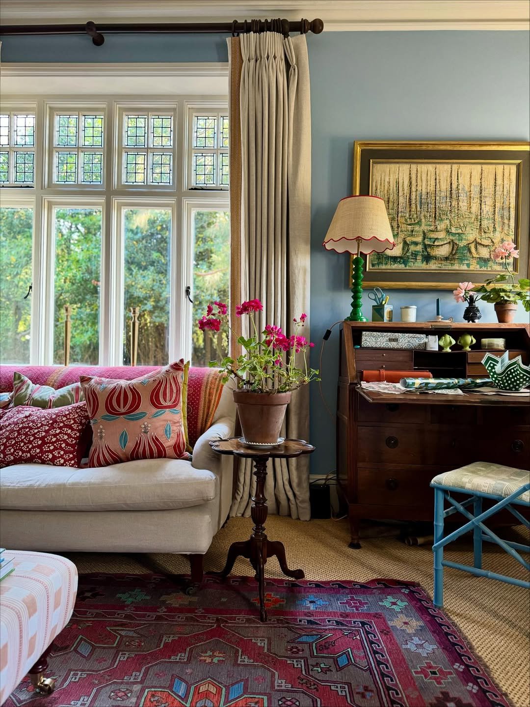 This space feels lived-in in the best way. The blue walls paired with warm reds and soft greens create a layered, slightly eclectic vibe that feels personal rather than styled.