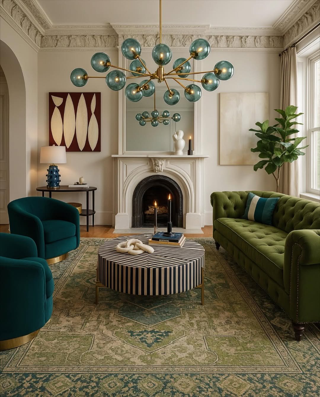 Okay but that chandelier? Instantly stealing the show. The mix of teal seating with that olive-toned sofa underneath such a dramatic fixture creates a layered, designer-level look. It feels curated, not just decorated.