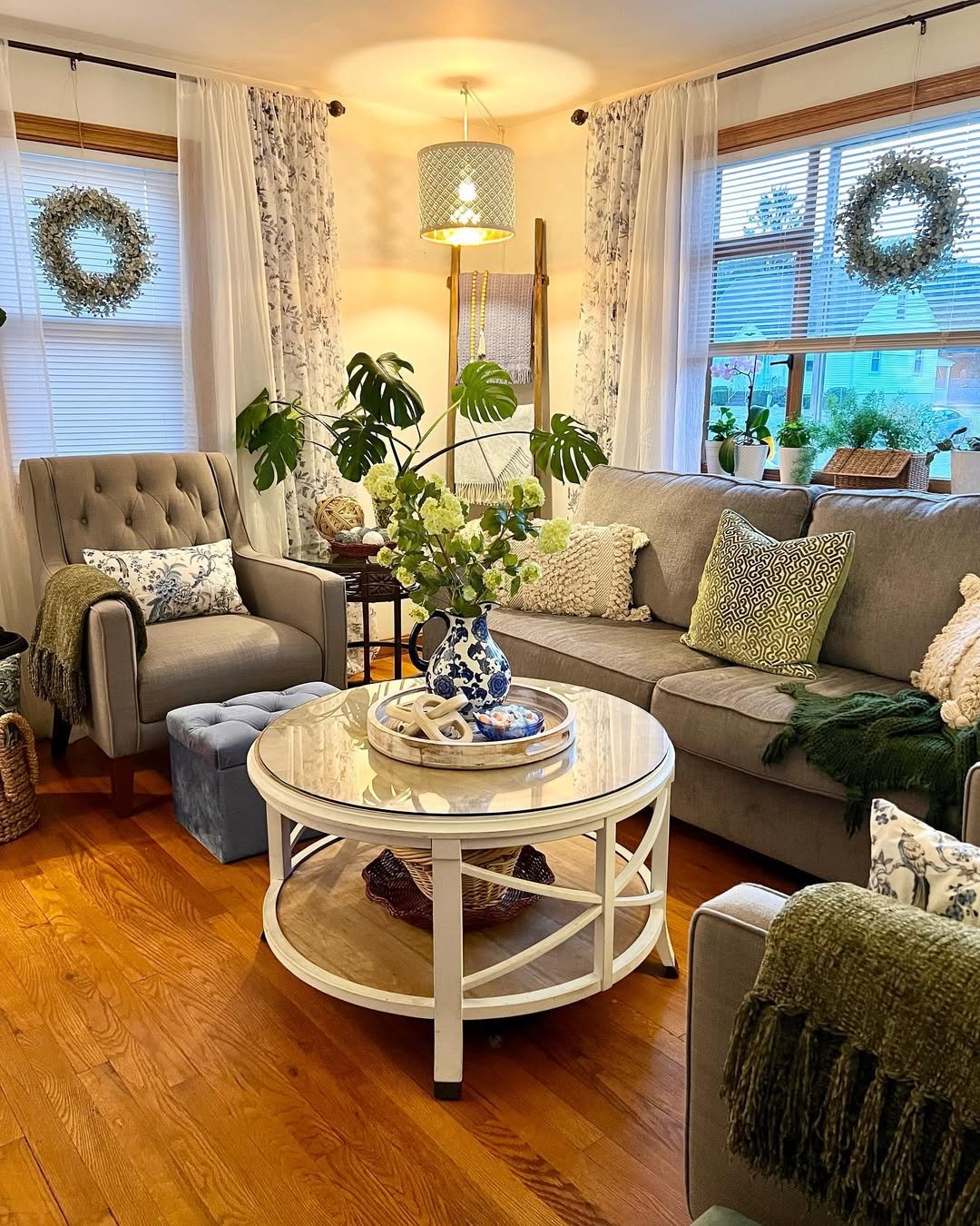 There’s something quietly beautiful about this one. The muted green sofa paired with soft blue walls feels fresh but still rooted in that vintage charm. The mix of classic furniture and delicate decor adds so much character.