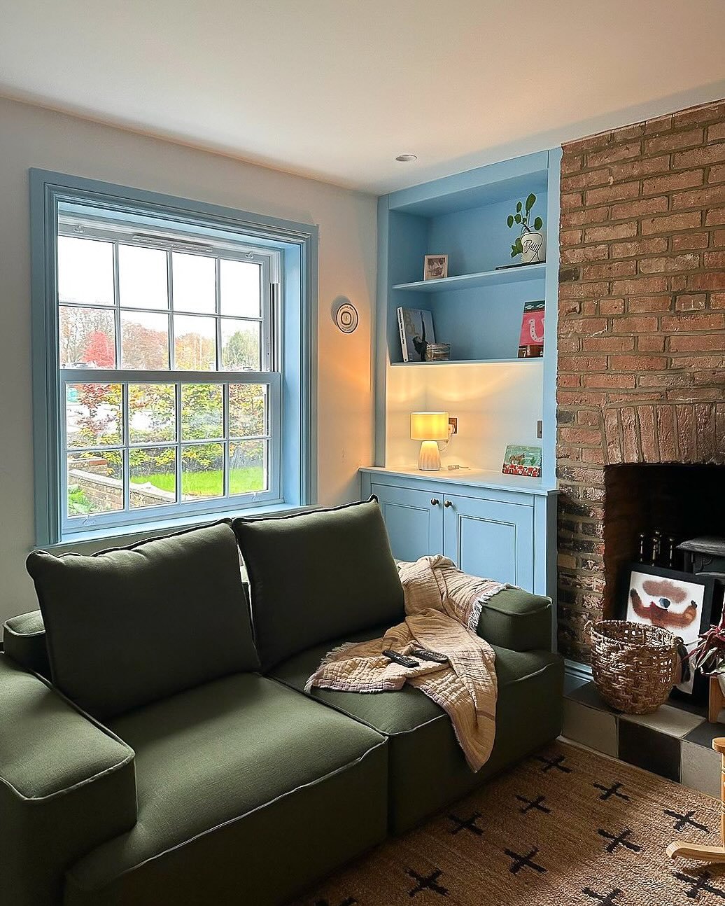 This cozy nook is doing a lot with a little. The blue built-ins paired with that deep green sofa create a perfect contrast without overwhelming the space. Add in the natural light, and everything just feels clean and fresh.