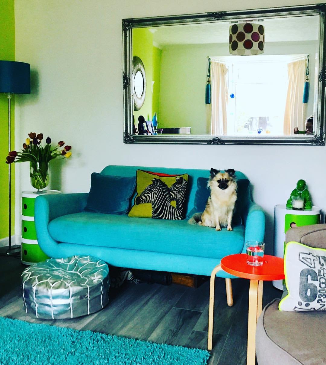 This one is pure energy. That bold blue sofa with pops of green and colorful textiles makes the whole space feel playful and alive. It’s small—but it doesn’t feel it.