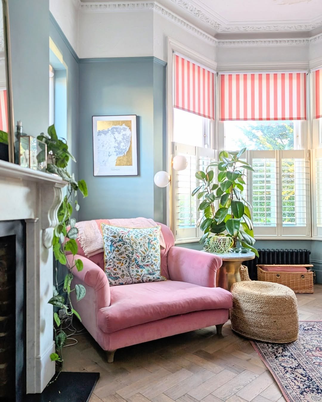 This room feels like a soft color dream. The mix of muted blue walls with blush tones and greenery creates a light, airy vibe that still feels cozy.