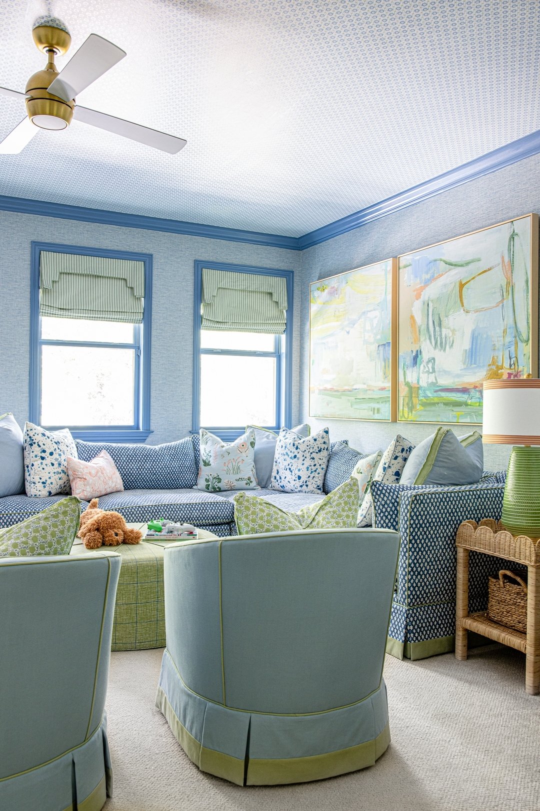 This room feels like a gentle mix of everything done right. The layered blue patterns with hints of green bring in just enough visual interest without overwhelming the space. It’s soft, but not boring—and that’s a hard balance to hit.