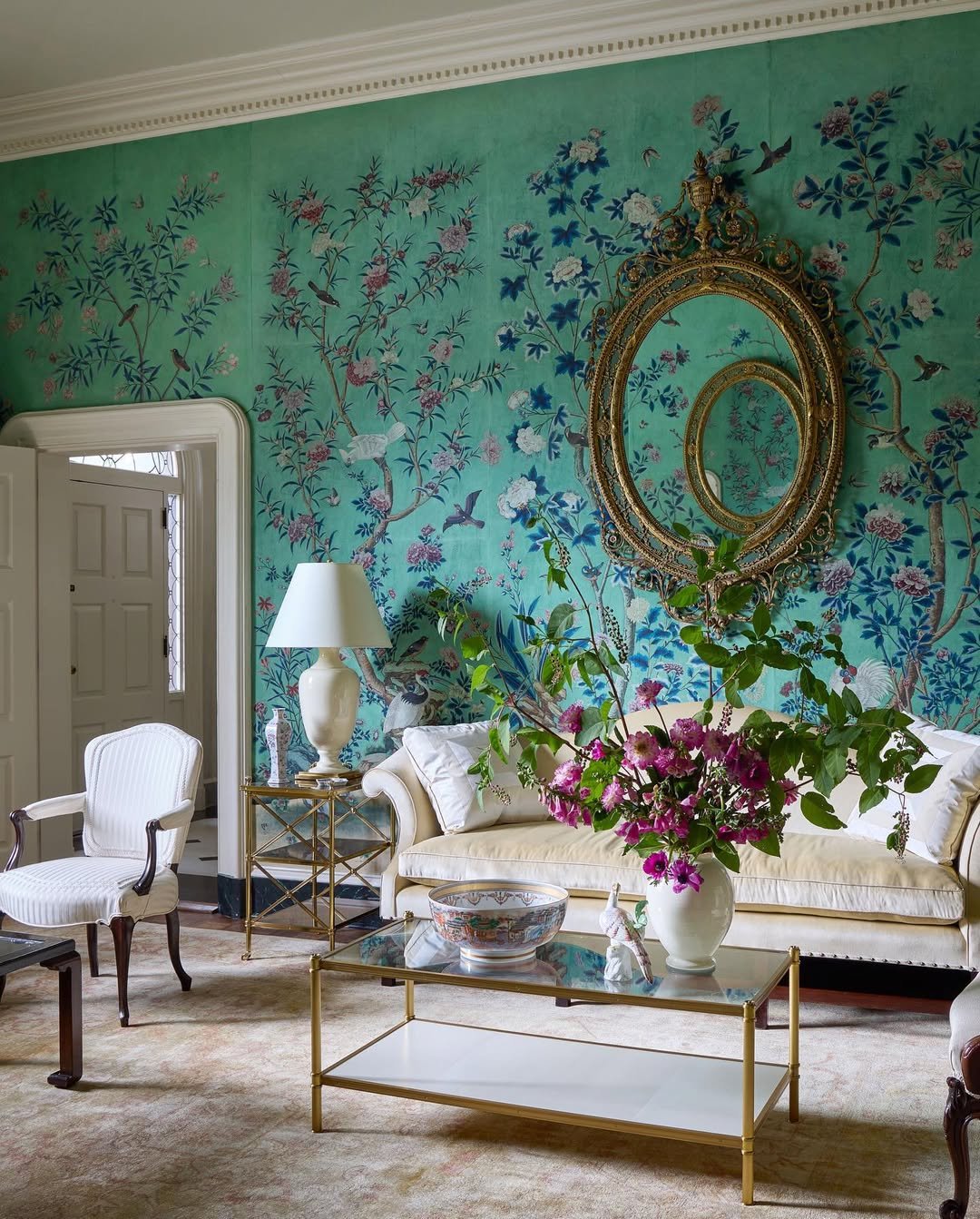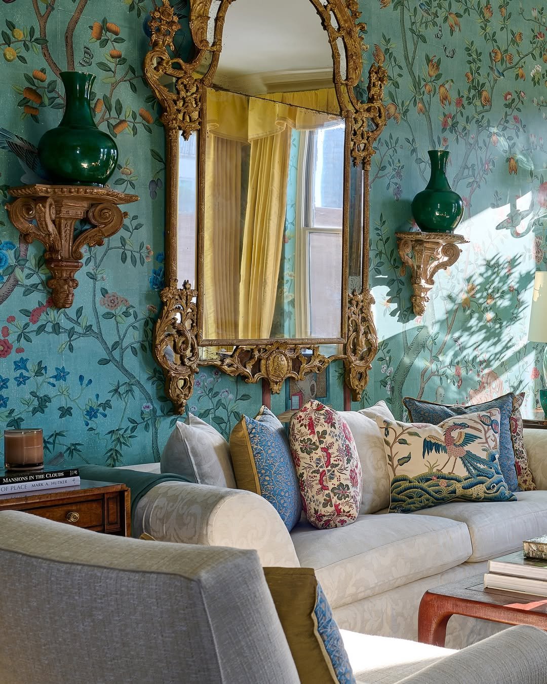 This one leans all the way into personality—and honestly, it pays off. That detailed green wallpaper, ornate mirror, and layered pillows create a rich, almost storybook-like vibe. It feels collected, not decorated.