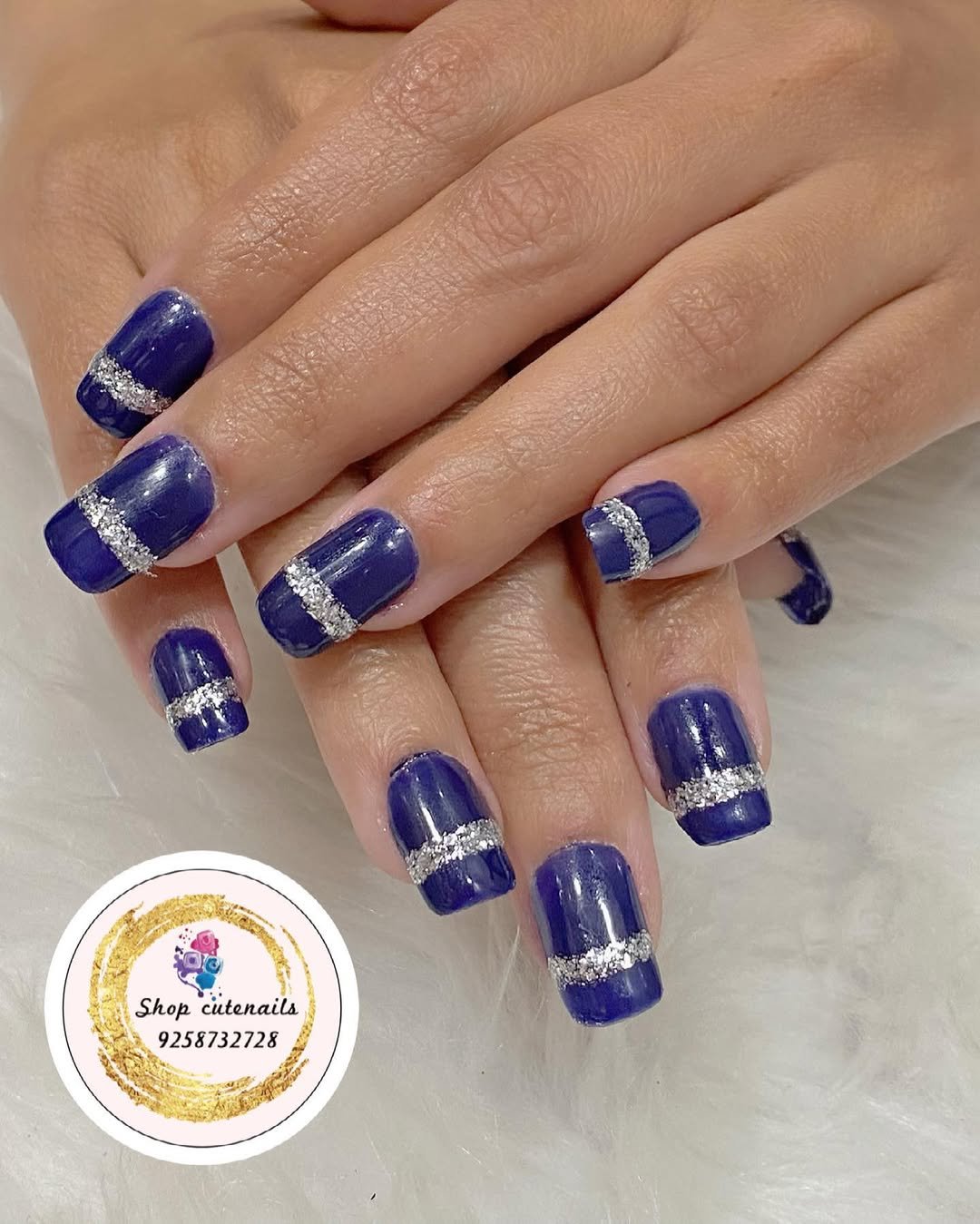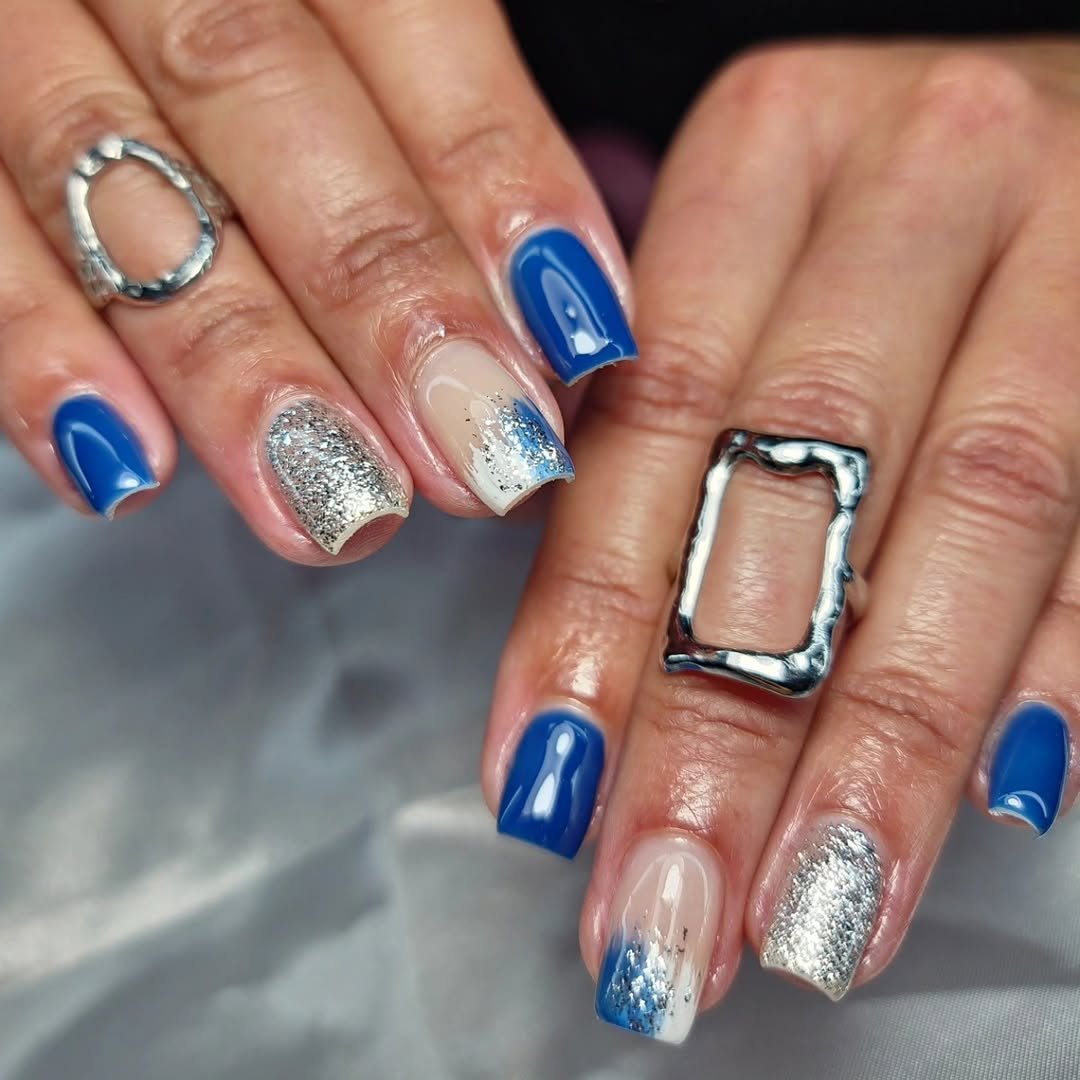 Short, glossy cobalt nails paired with full silver glitter accents? Clean. Sharp. Effective. The subtle blue-to-silver fade on the nude base adds just enough detail to keep it interesting.