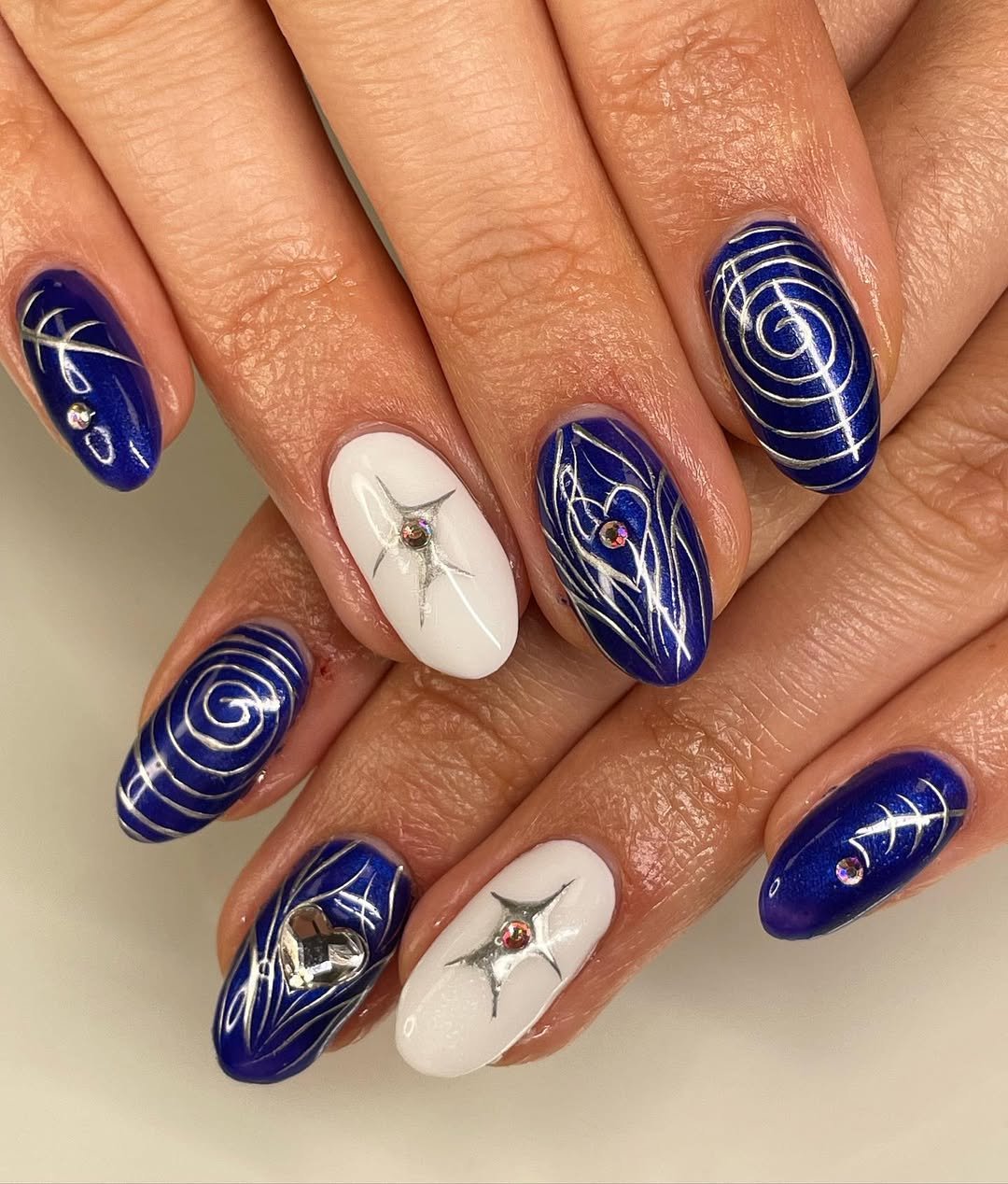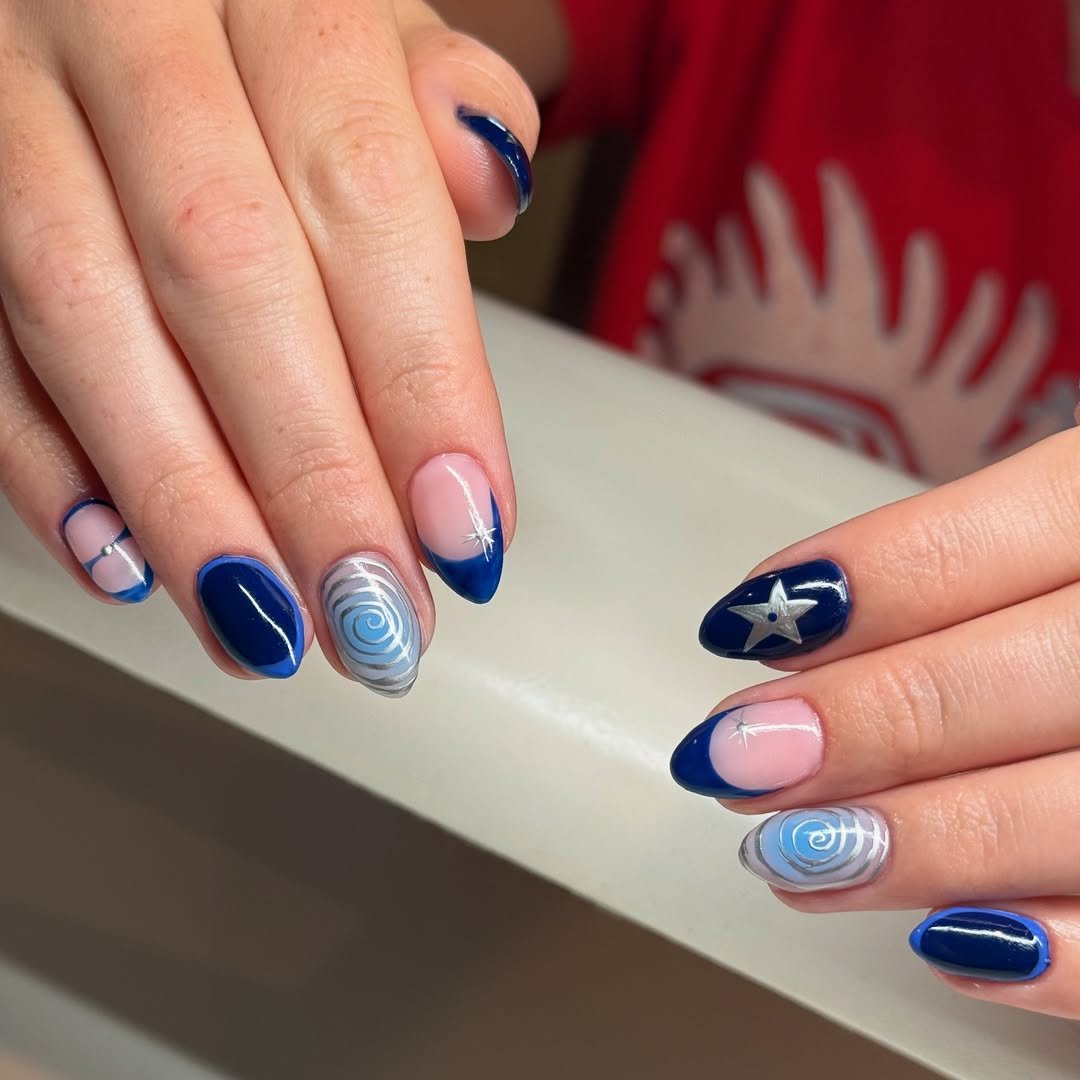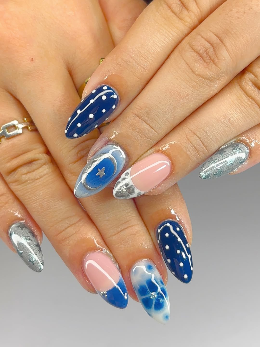 Bold navy, soft blush bases, silver stars, and swirled accents all come together in a playful, graphic mix. Each nail has its own personality but still feels cohesive.