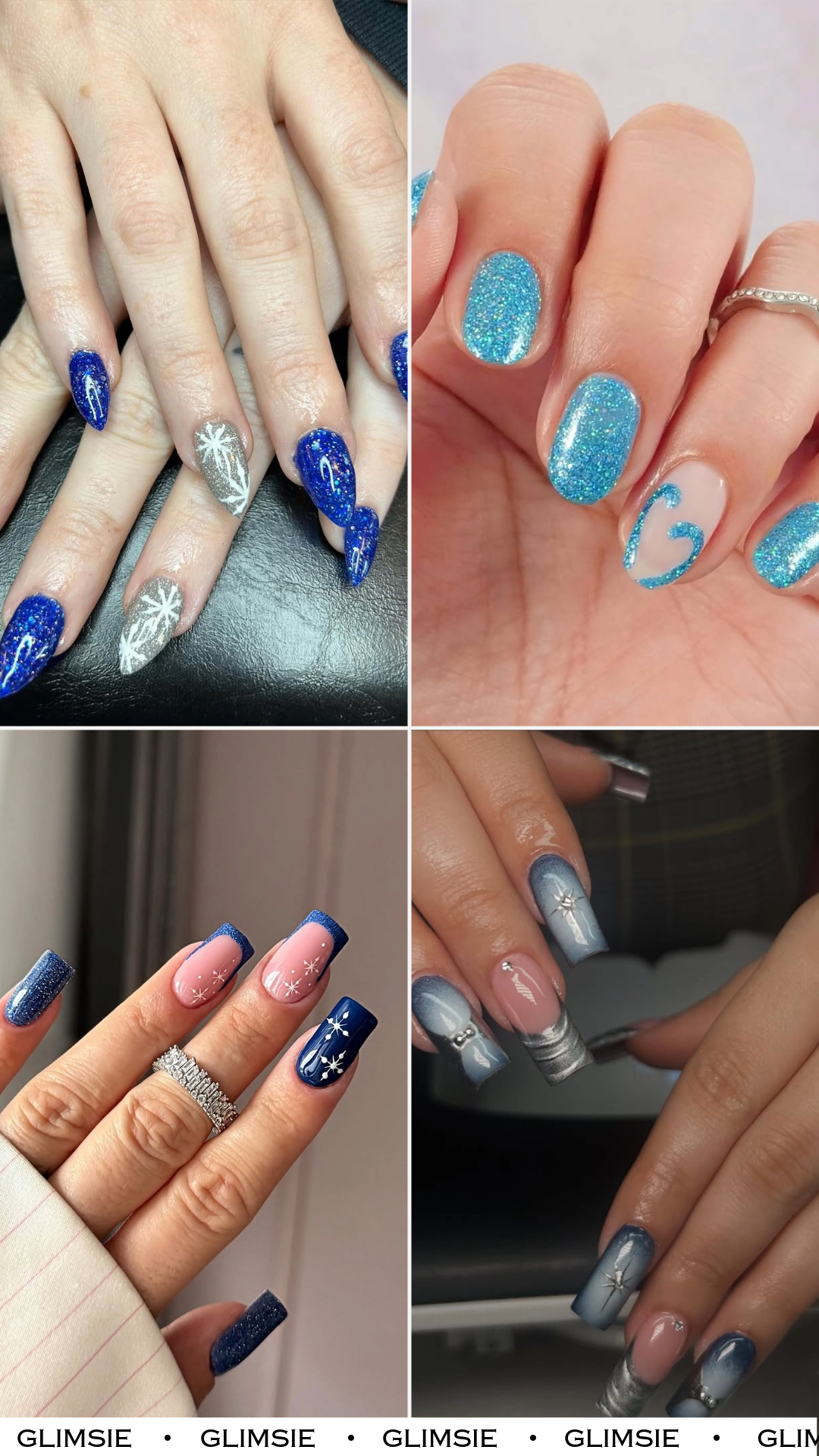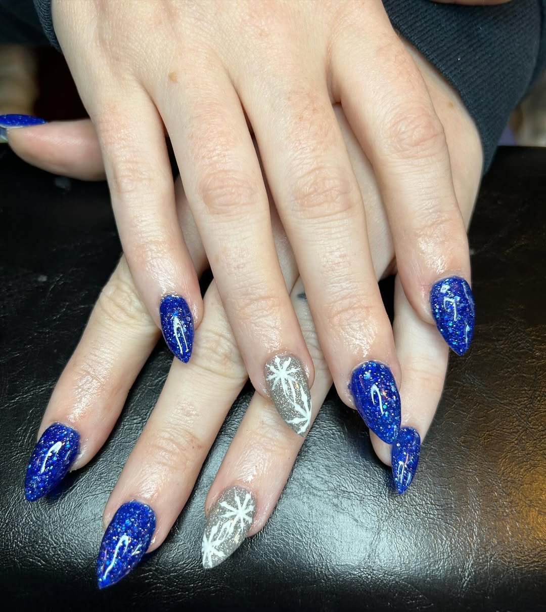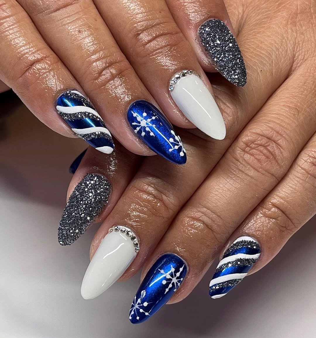 This one doesn’t hold back — deep metallic blue, textured silver glitter, crisp white accents, and snowflake details all in one set. It’s bold but balanced, with every nail doing its own thing without clashing.