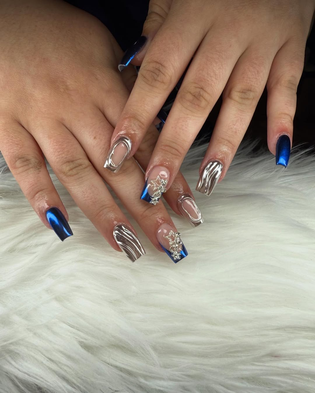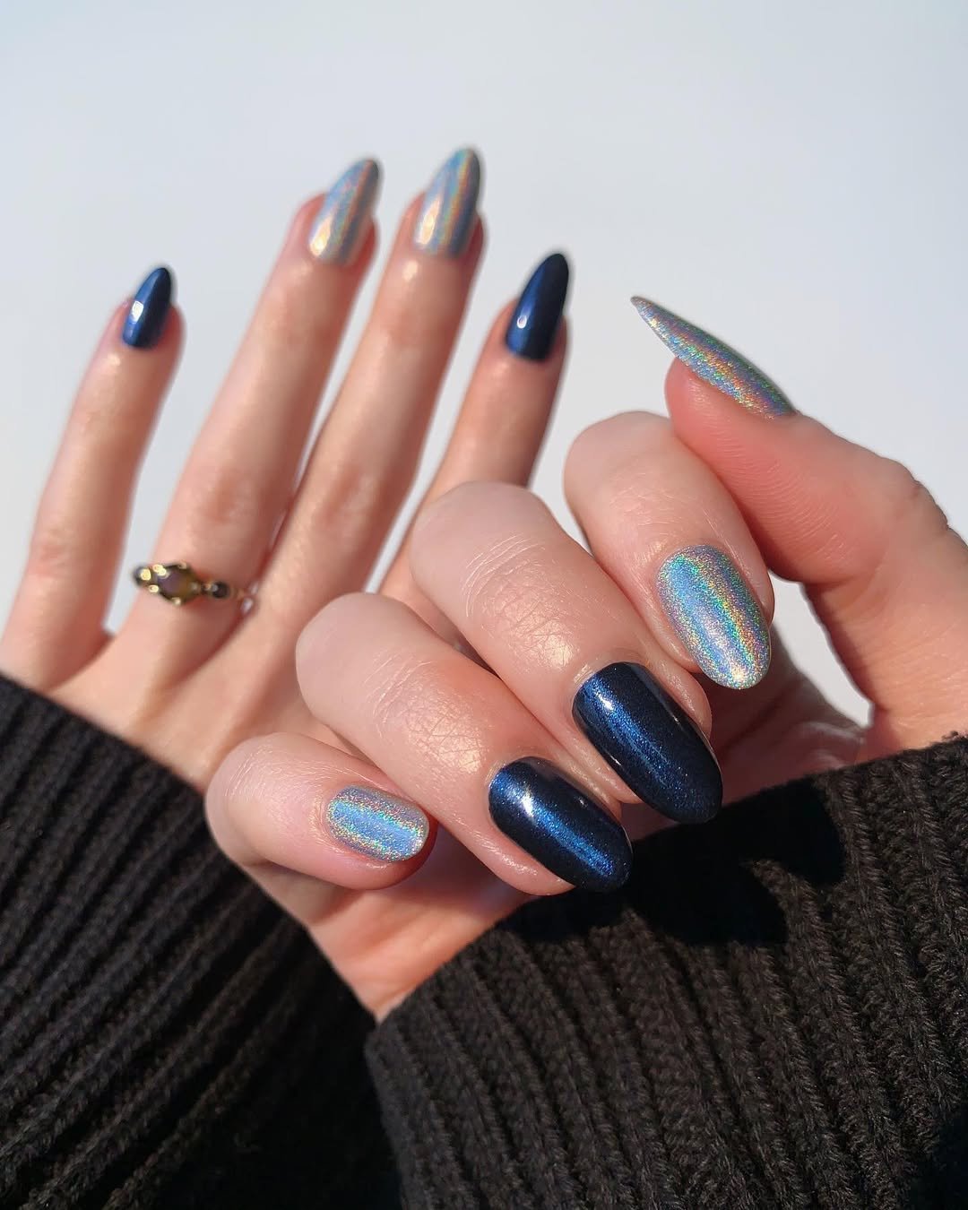 That holographic silver paired with rich midnight blue is such a striking combo. One nail catches the light like a prism, the next grounds it with deep metallic depth.