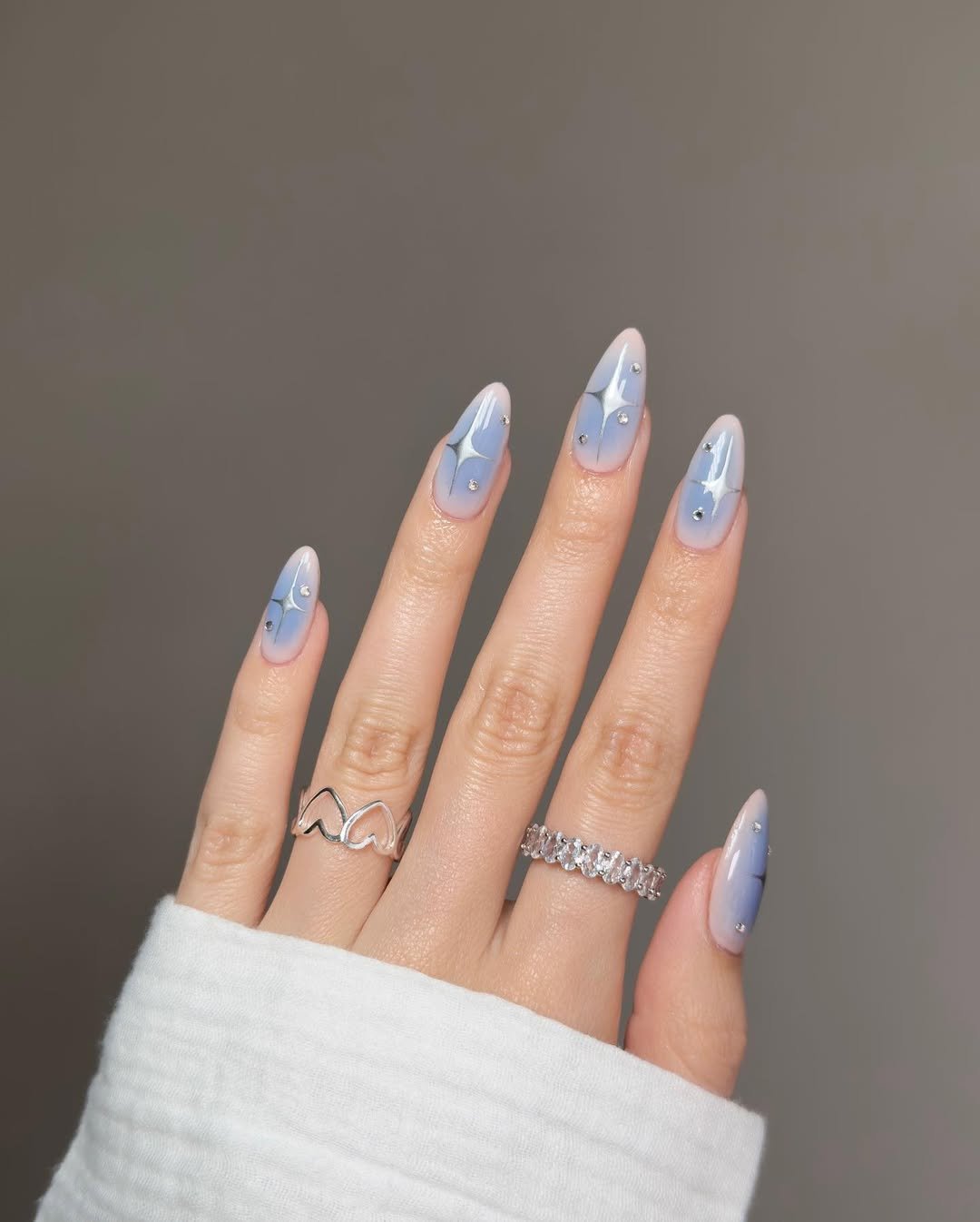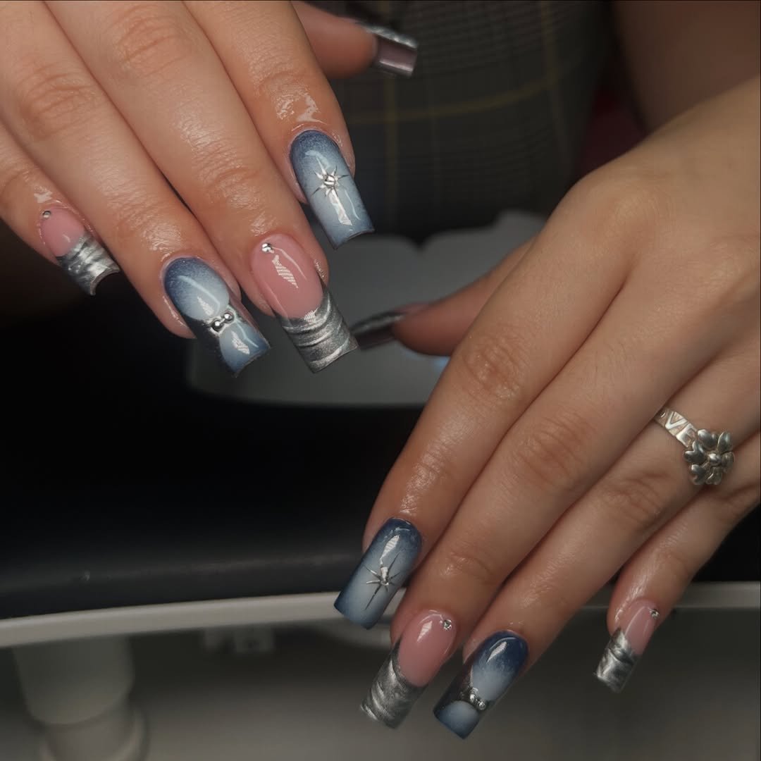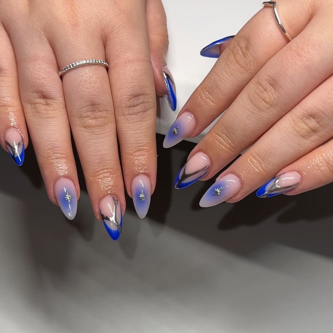 These almond-shaped beauties blend soft ombré bases with sharp blue French tips and silver chrome streaks. The tiny star accents are subtle but elevate the whole design.