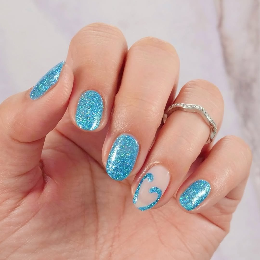 That pop of blue glitter hearts against neutral bases? Chef’s kiss. It’s playful, sparkly, and still surprisingly chic — the kind of design that feels fun but not childish.