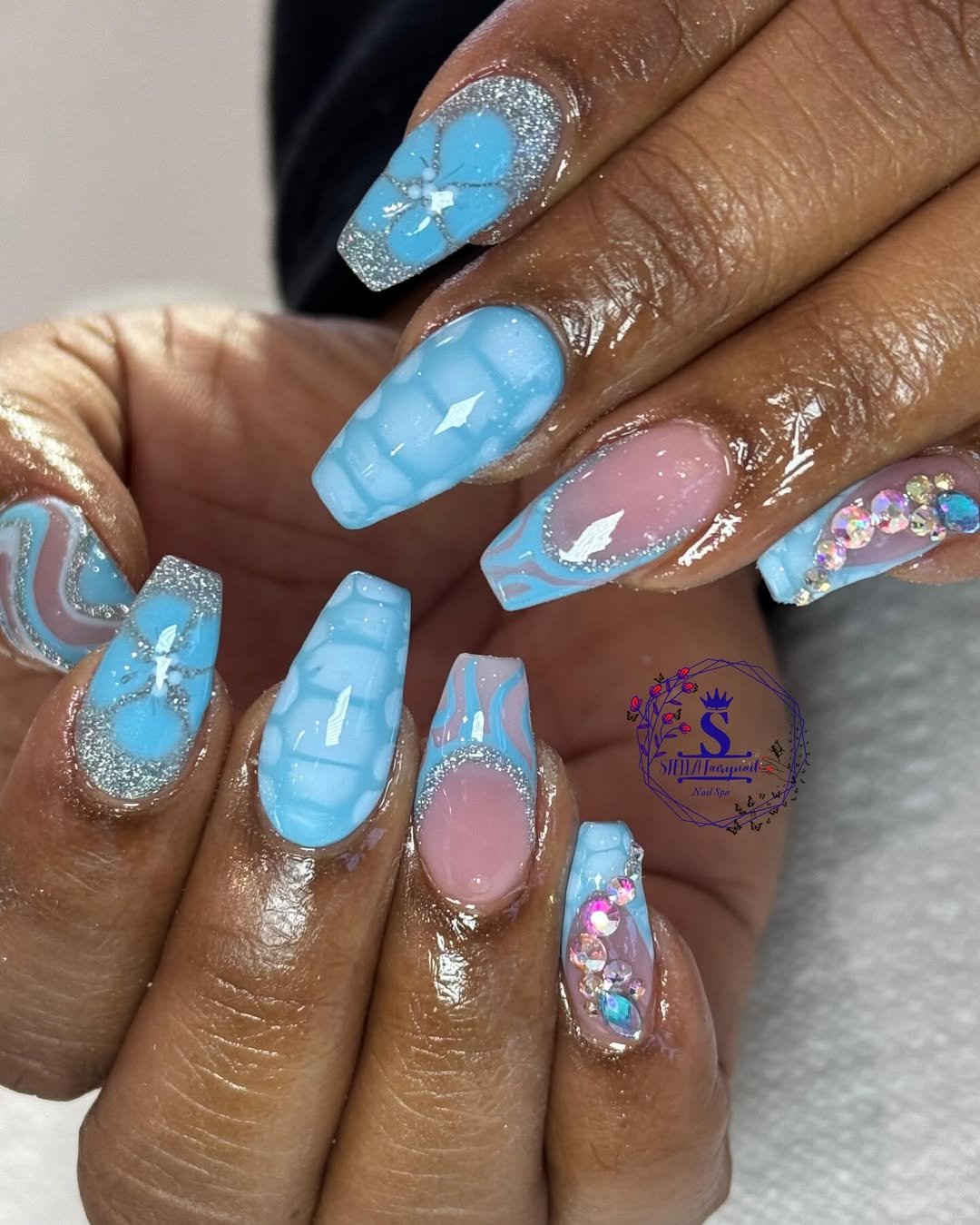 Okay but these are straight-up winter fairytale nails. That baby blue palette mixed with glitter edges and crystal accents feels magical in the best way — soft, sparkly, and just a little extra.