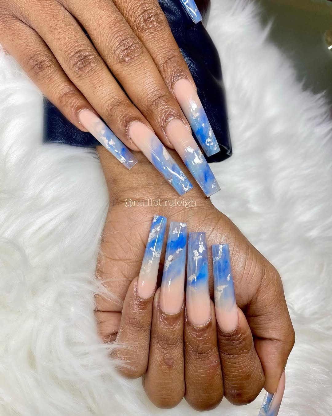 These long coffin nails melt from soft nude into a cloudy sky blue so seamlessly, it almost looks airbrushed by nature. The scattered silver foil adds just enough shimmer — like sunlight catching fresh snow.