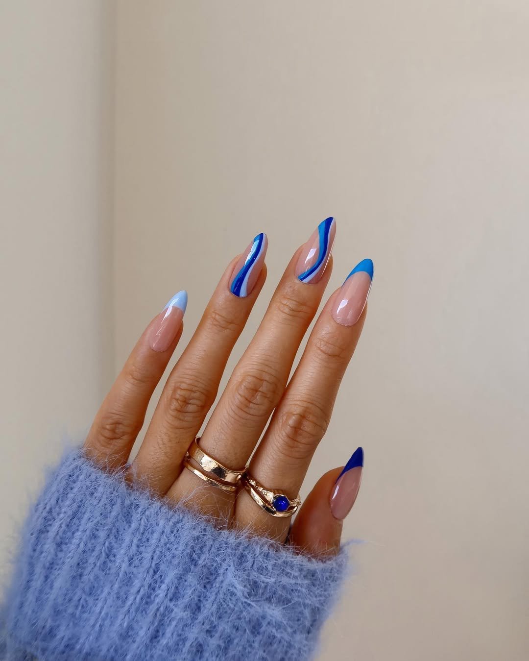 This set leans into modern cool with sleek blue tips and graphic curves that feel fresh and editorial. It’s that perfect balance between minimal and artsy — polished, but not trying too hard.