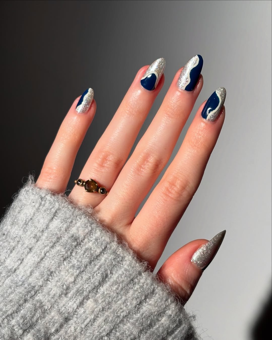 Deep navy curves meeting bold silver glitter waves? This set is pure contrast perfection. The high shine against that textured sparkle makes every nail look dimensional.