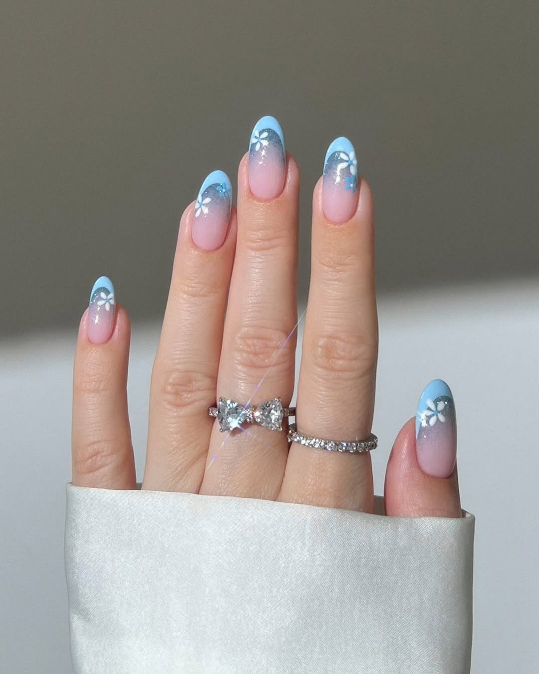 Here’s the softer side of blue and silver — airy gradients with tiny floral details that feel fresh and light. The shimmer is gentle, letting the design breathe.