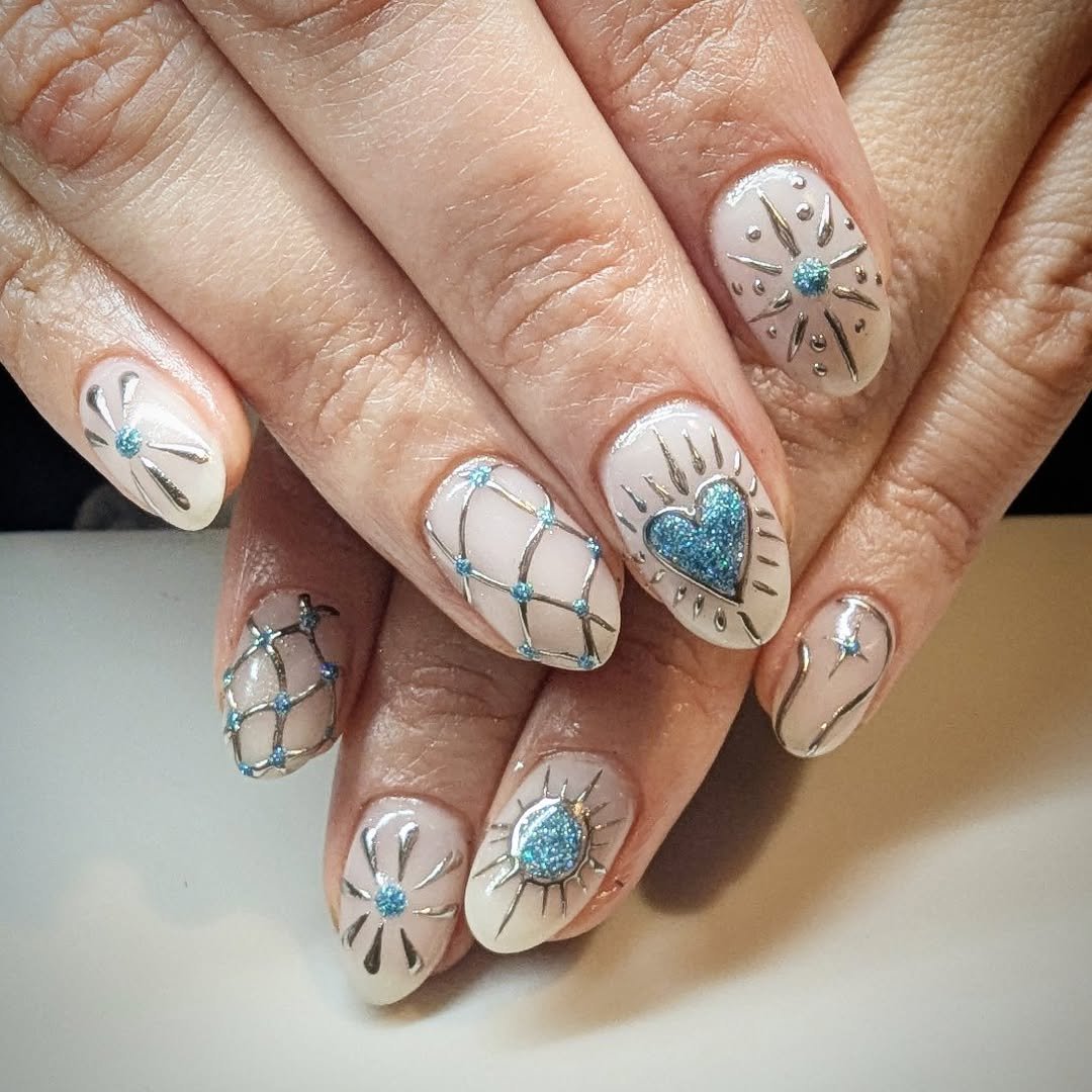 Neutral bases decorated with silver metallic linework and icy blue crystal accents create such an elevated, almost jewelry-inspired look. The blue glitter heart detail is the sweetest little focal point.