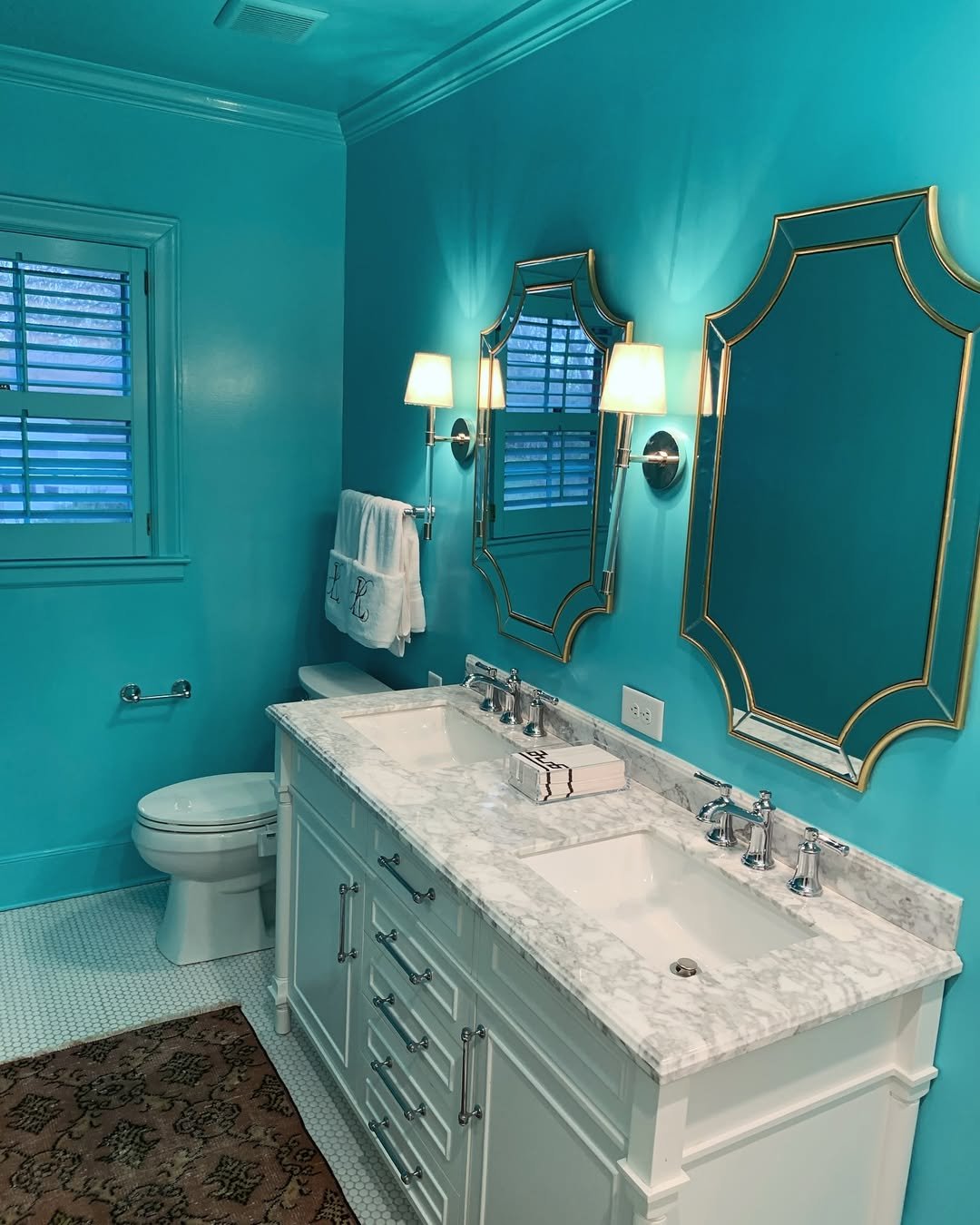 This space is pure energy. The bright aqua walls bring a fresh, almost playful vibe, while the crisp white vanity keeps everything feeling clean and structured.